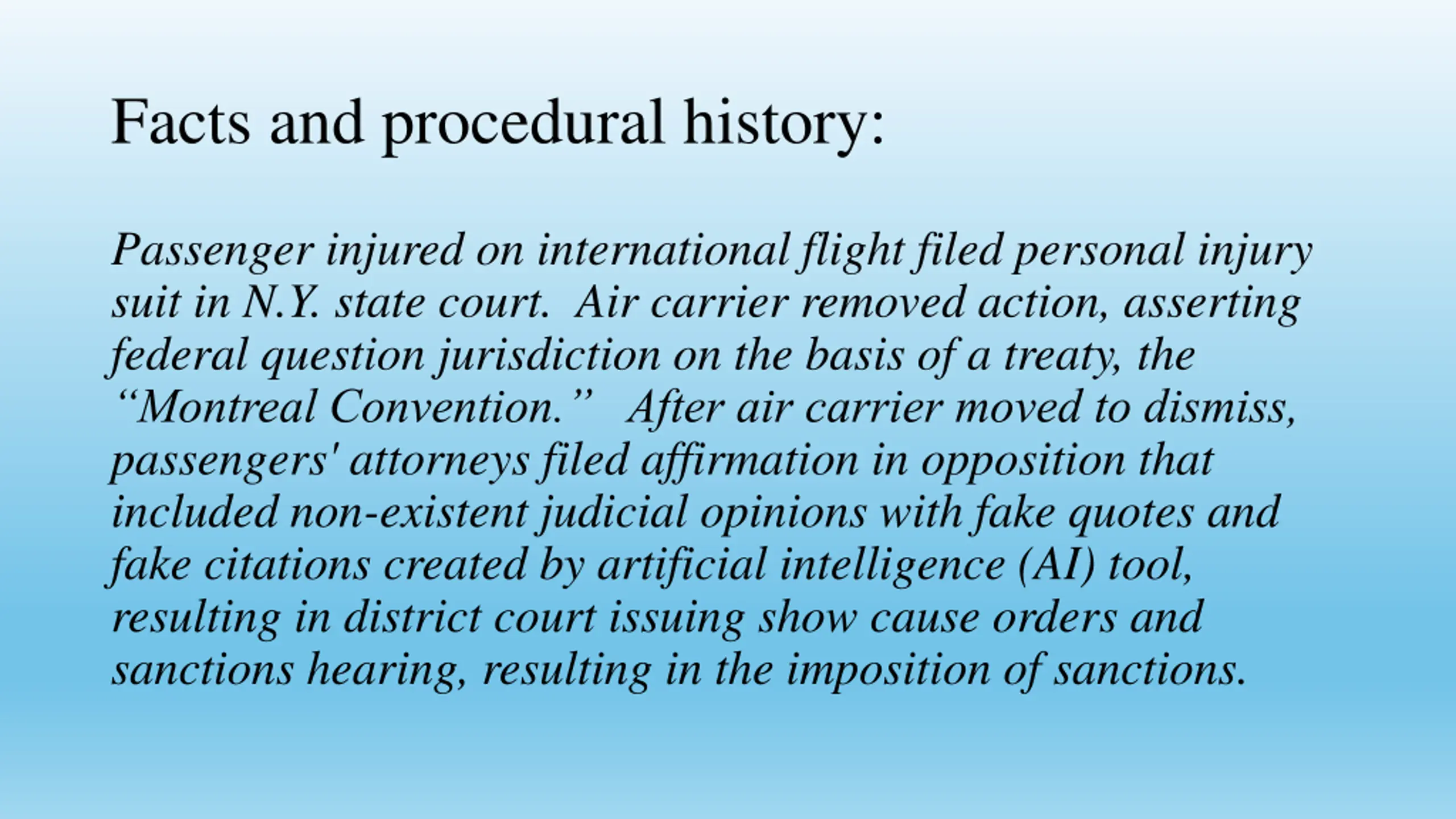 Facts and procedural history: Passenger injured on international flight filed personal injury suit in N.Y. state court. Air carrier removed action, asserting federal question jurisdiction on the basis of a treaty, the Montreal Convention. After air carrier moved to dismiss, passengers' attorneys filed affirmation in opposition that included non-existent judicial opinions with fake quotes and fake citations created by artificial intelligence (AI) tool, resulting in district court issuing show cause orders and sanctions hearing, resulting in the imposition of sanctions.