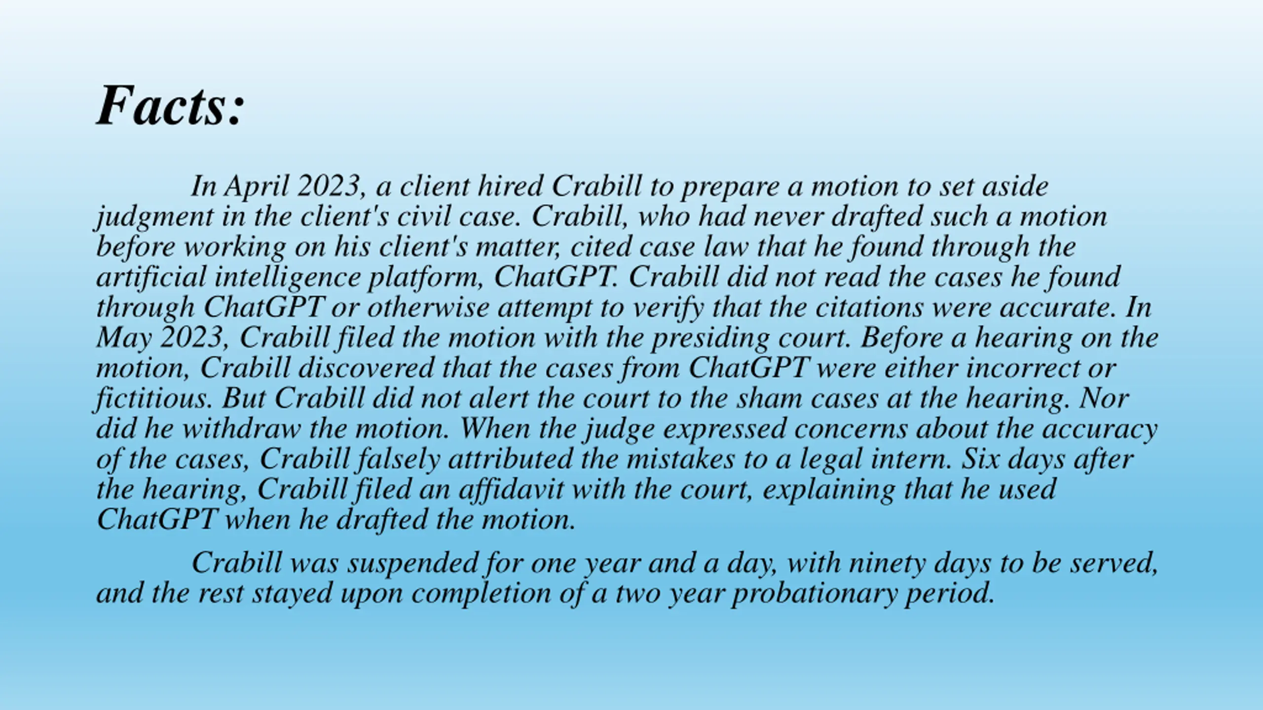 Facts: In April 2023, a client hired Crabill to prepare a motion to set aside judgment in the client's civil case. Crabill, who had never drafted such a motion before working on his client's matter, cited case law that he found through the artificial intelligence platform, ChatGPT. Crabill did not read the cases he found through ChatGPT or otherwise attempt to verify that the citations were accurate. In May 2023, Crabill filed the motion with the presiding court. Before a hearing on the motion, Crabill discovered that the cases from ChatGPT were either incorrect or fictitious. But Crabill did not alert the court to the sham cases at the hearing. Nor did he withdraw the motion. When the judge expressed concerns about the accuracy of the cases, Crabill falsely attributed the mistakes to a legal intern. Six days after the hearing, Crabill filed an affidavit with the court, explaining that he used ChatGPT when he drafted the motion. Crabill was suspended for one year and a day, with ninety days to be served, and the rest stayed upon completion of a two year probationary period.