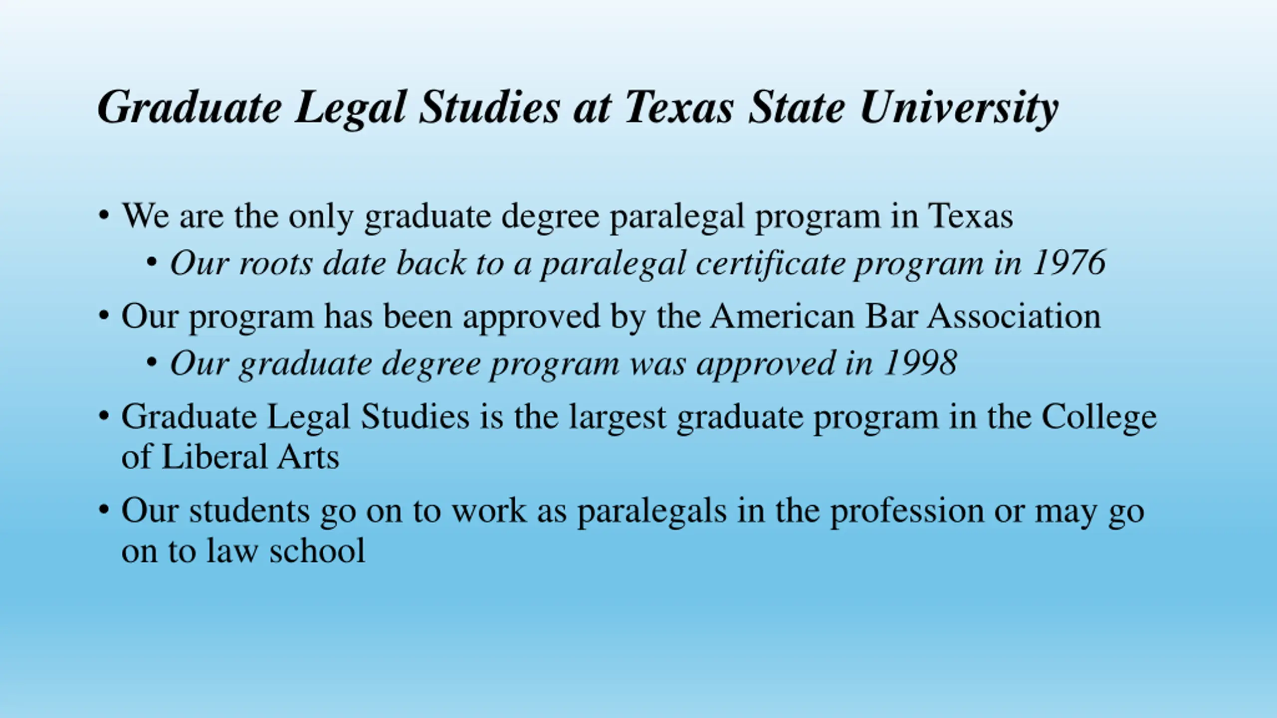 Graduate Legal Studies at Texas State University We are the only graduate degree paralegal program in Texas Our roots date back to a paralegal certificate program in 1976 Our program has been approved by the American Bar Association Our graduate degree program was approved in 1998 Graduate Legal Studies is the largest graduate program in the College of Liberal Arts Our students go on to work as paralegals in the profession or may go on to law school