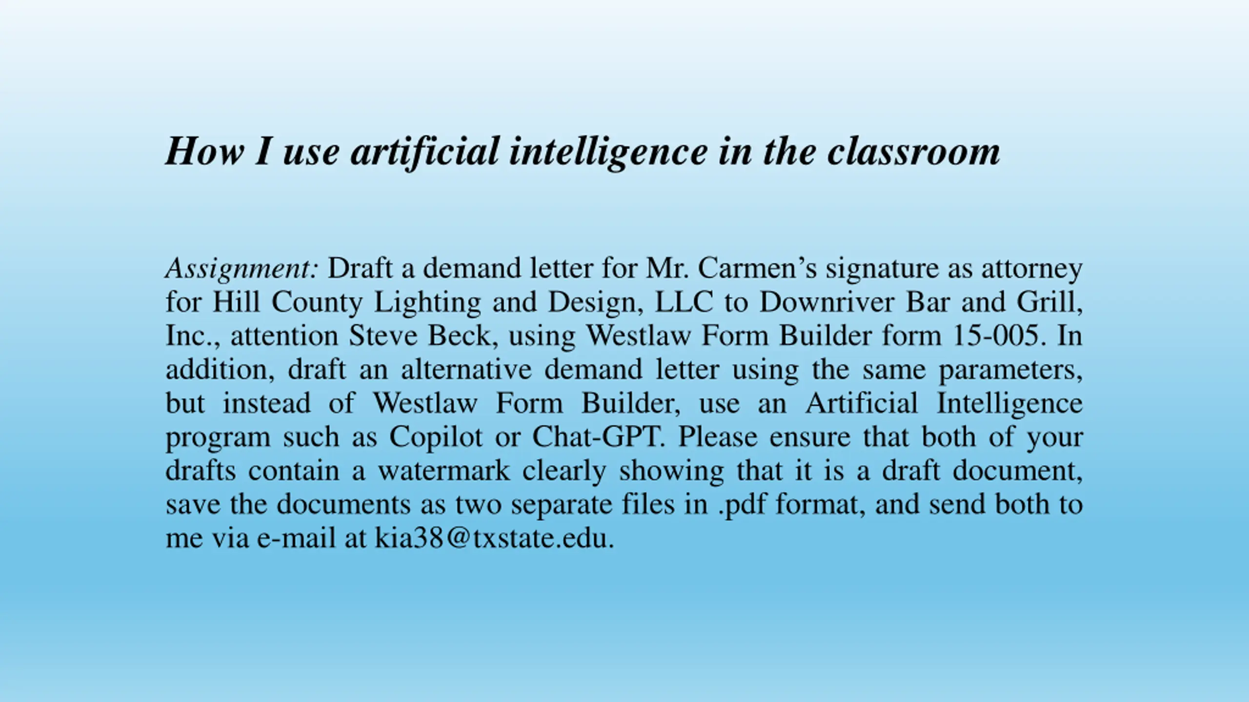 How I use artificial intelligence in the classroom Assignment: Draft a demand letter for Mr. Carmen s signature as attorney for Hill County Lighting and Design, LLC to Downriver Bar and Grill, Inc., attention Steve Beck, using Westlaw Form Builder form 15-005. In addition, draft an alternative demand letter using the same parameters, but instead of Westlaw Form Builder, use an Artificial Intelligence program such as Copilot or Chat-GPT. Please ensure that both of your drafts contain a watermark clearly showing that it is a draft document, save the documents as two separate files in .pdf format, and send both to me via e-mail at kia38@txstate.edu.