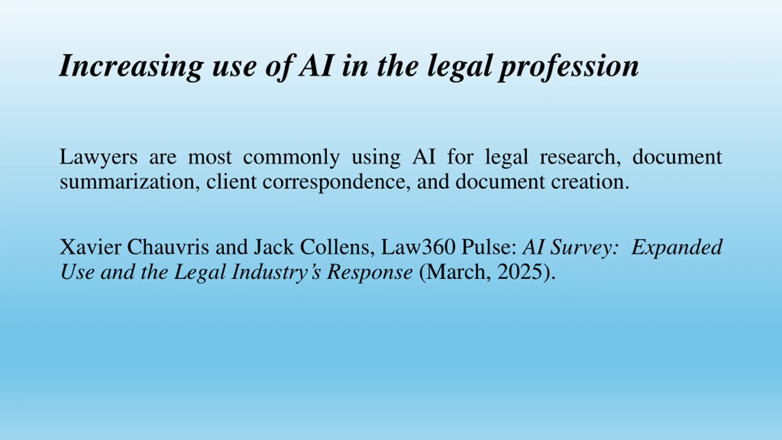 Increasing use of AI in the legal profession Lawyers are most commonly using AI for legal research, document summarization, client correspondence, and document creation. Xavier Chauvris and Jack Collens, Law360 Pulse: AI Survey: Expanded Use and the Legal Industry s Response (March, 2025).