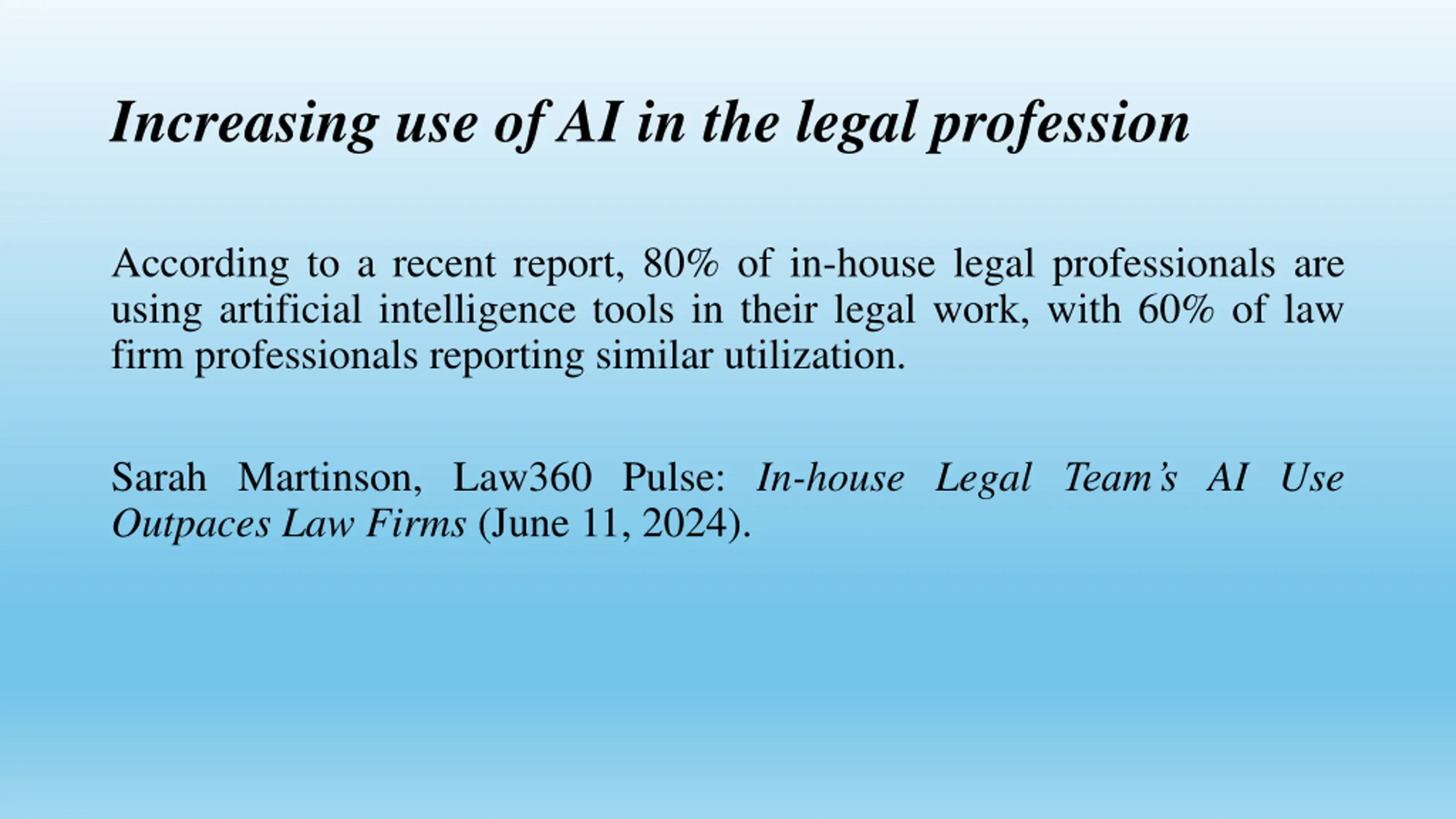 Increasing use of AI in the legal profession According to a recent report, 80% of in-house legal professionals are using artificial intelligence tools in their legal work, with 60% of law firm professionals reporting similar utilization. Sarah Martinson, Law360 Pulse: In-house Legal Team s AI Use Outpaces Law Firms (June 11, 2024).