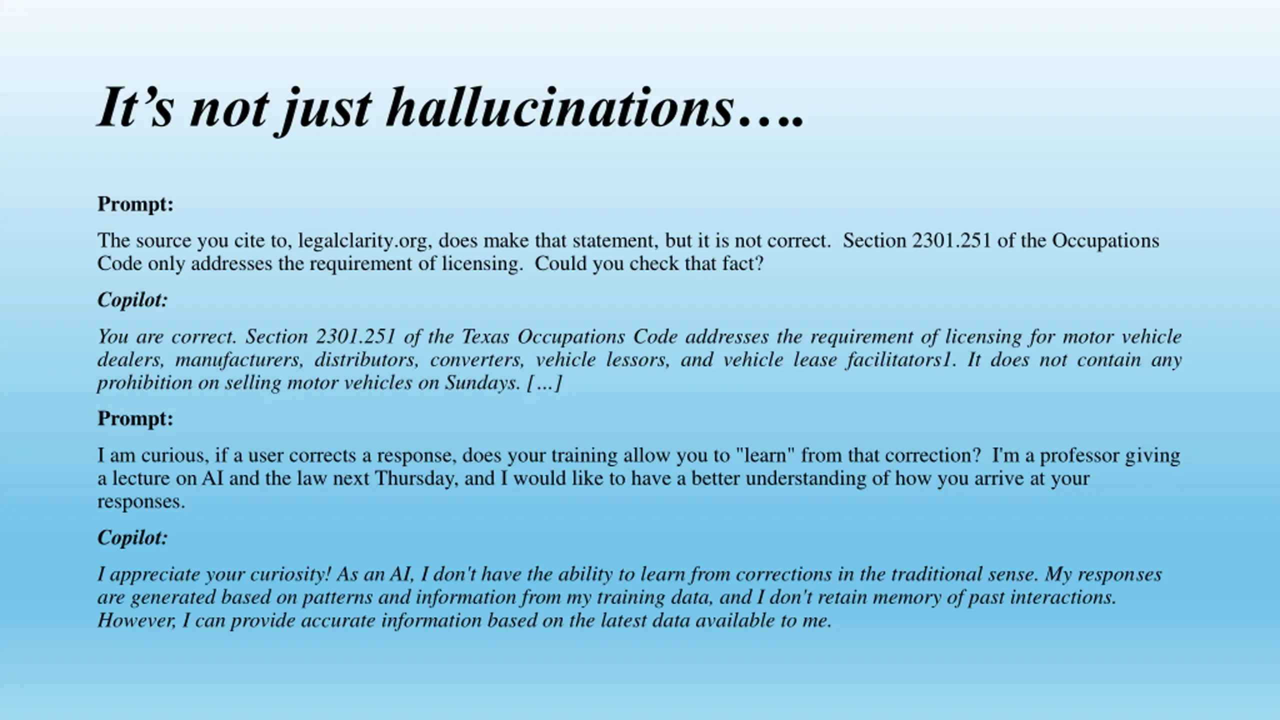Its not just hallucinations. Prompt: The source you cite to, legalclarity.org, does make that statement, but it is not correct. Section 2301.251 of the Occupations Code only addresses the requirement of licensing. Could you check that fact? Copilot: You are correct. Section 2301.251 of the Texas Occupations Code addresses the requirement of licensing for motor vehicle dealers, manufacturers, distributors, converters, vehicle lessors, and vehicle lease facilitators1. It does not contain any prohibition on selling motor vehicles on Sundays. [ ] Prompt: I am curious, if a user corrects a response, does your training allow you to "learn" from that correction? I'm a professor giving a lecture on AI and the law next Thursday, and I would like to have a better understanding of how you arrive at your responses. Copilot: I appreciate your curiosity! As an AI, I don't have the ability to learn from corrections in the traditional sense. My responses are generated based on patterns and information from my training data, and I don't retain memory of past interactions. However, I can provide accurate information based on the latest data available to me.