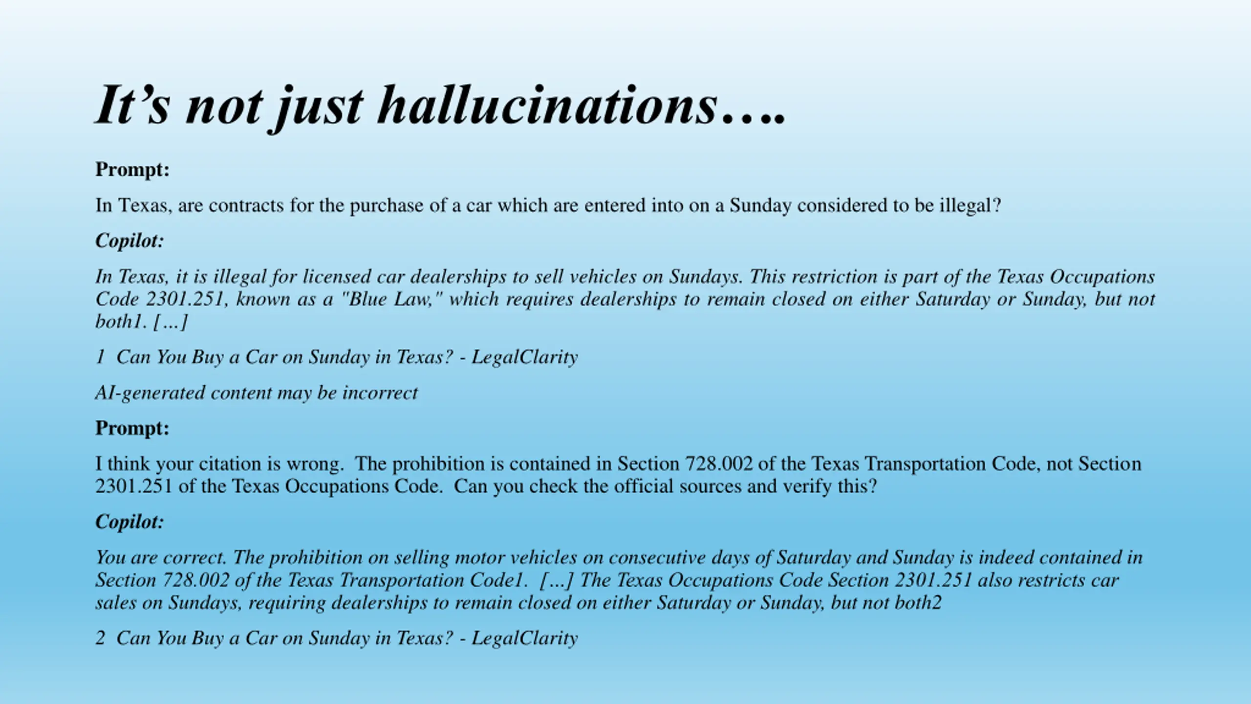 Its not just hallucinations. Prompt: In Texas, are contracts for the purchase of a car which are entered into on a Sunday considered to be illegal? Copilot: In Texas, it is illegal for licensed car dealerships to sell vehicles on Sundays. This restriction is part of the Texas Occupations Code 2301.251, known as a "Blue Law," which requires dealerships to remain closed on either Saturday or Sunday, but not both1. [ ] 1 Can You Buy a Car on Sunday in Texas? - LegalClarity AI-generated content may be incorrect Prompt: I think your citation is wrong. The prohibition is contained in Section 728.002 of the Texas Transportation Code, not Section 2301.251 of the Texas Occupations Code. Can you check the official sources and verify this? Copilot: You are correct. The prohibition on selling motor vehicles on consecutive days of Saturday and Sunday is indeed contained in Section 728.002 of the Texas Transportation Code1. [ ] The Texas Occupations Code Section 2301.251 also restricts car sales on Sundays, requiring dealerships to remain closed on either Saturday or Sunday, but not both2 2 Can You Buy a Car on Sunday in Texas? - LegalClarity