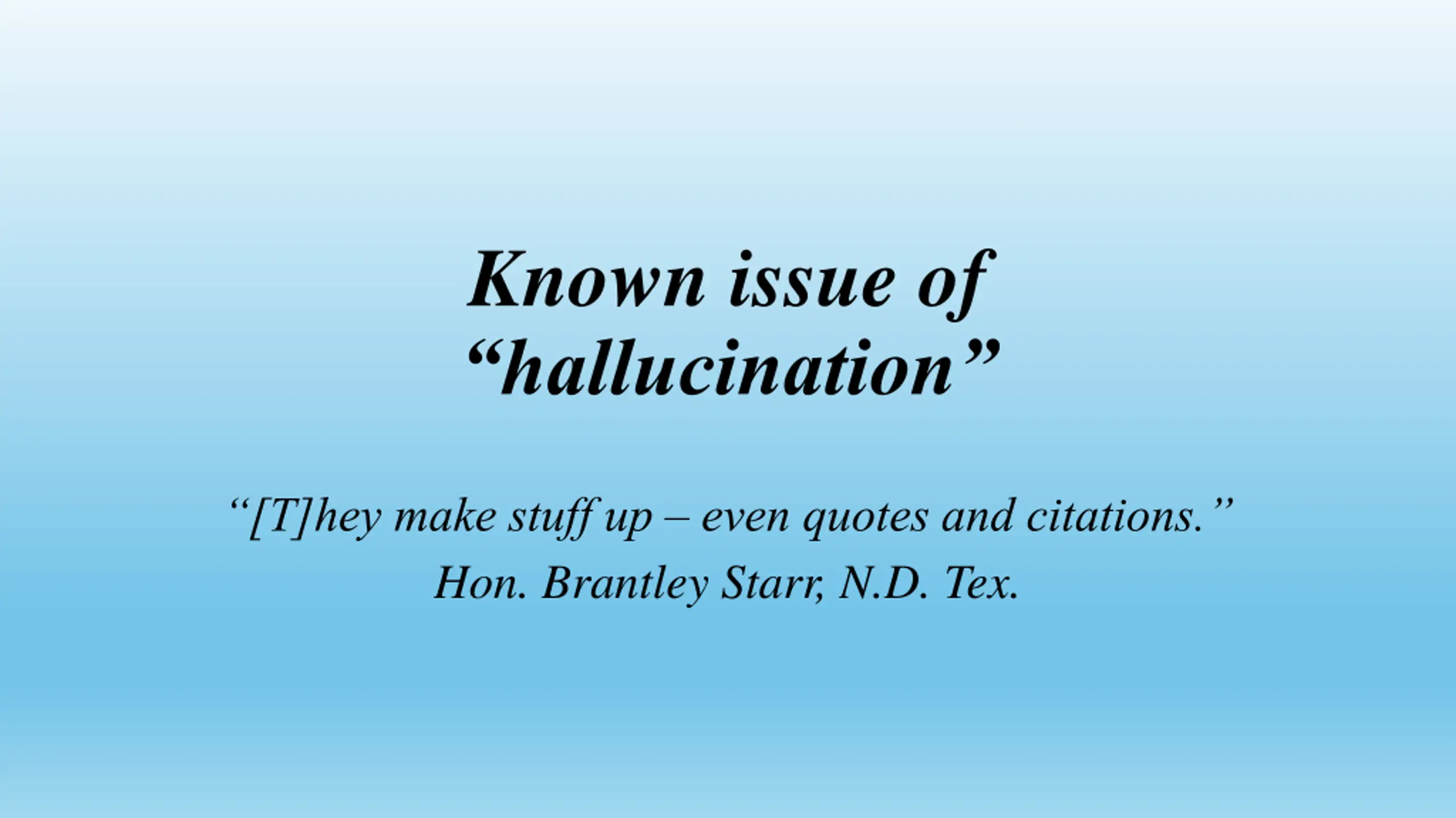 Known issue of hallucination [T]hey make stuff up even quotes and citations. Hon. Brantley Starr, N.D. Tex.