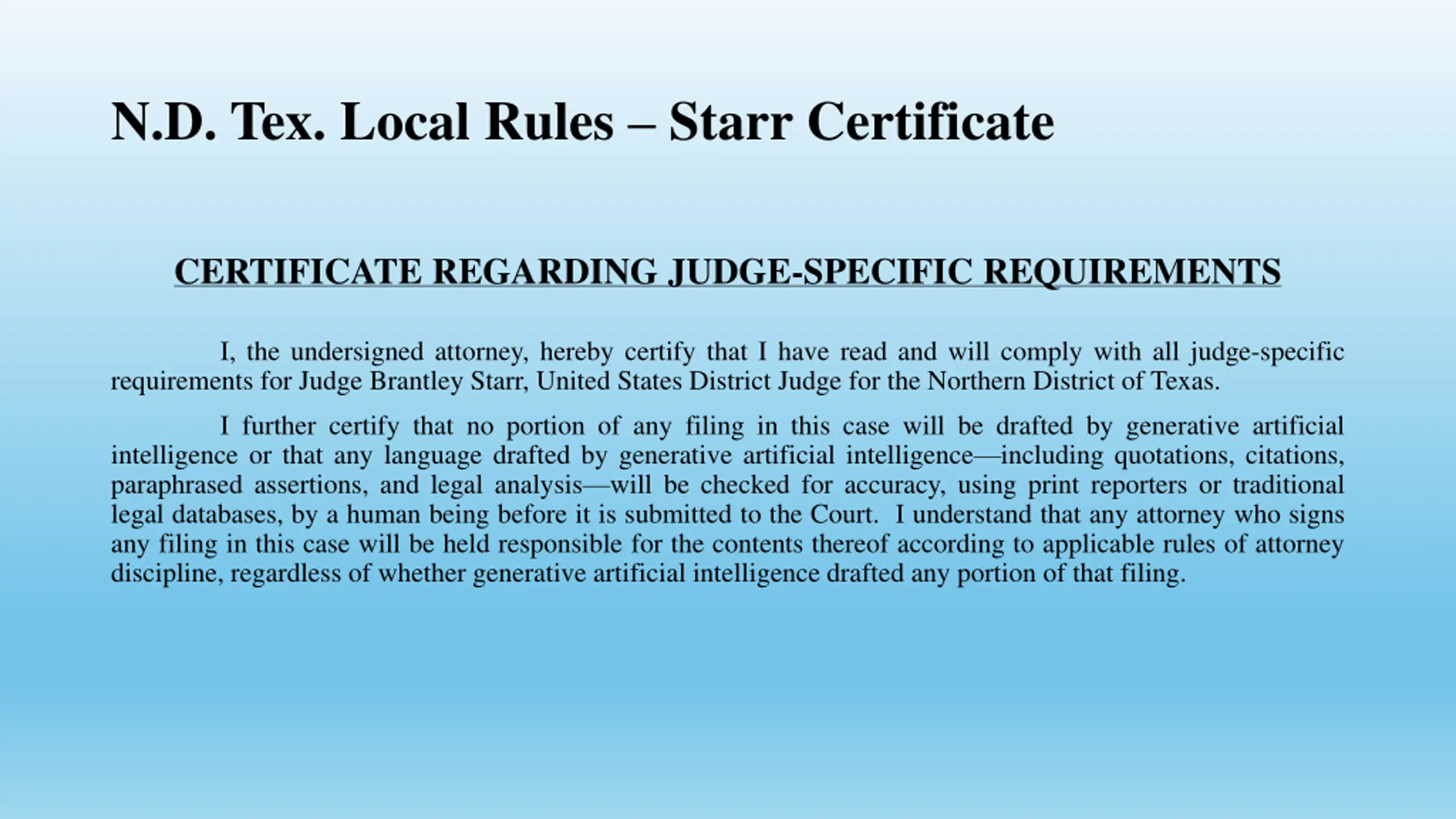 N.D. Tex. Local Rules Starr Certificate CERTIFICATE REGARDING JUDGE-SPECIFIC REQUIREMENTS I, the undersigned attorney, hereby certify that I have read and will comply with all judge-specific requirements for Judge Brantley Starr, United States District Judge for the Northern District of Texas. I further certify that no portion of any filing in this case will be drafted by generative artificial intelligence or that any language drafted by generative artificial intelligence including quotations, citations, paraphrased assertions, and legal analysis will be checked for accuracy, using print reporters or traditional legal databases, by a human being before it is submitted to the Court. I understand that any attorney who signs any filing in this case will be held responsible for the contents thereof according to applicable rules of attorney discipline, regardless of whether generative artificial intelligence drafted any portion of that filing.