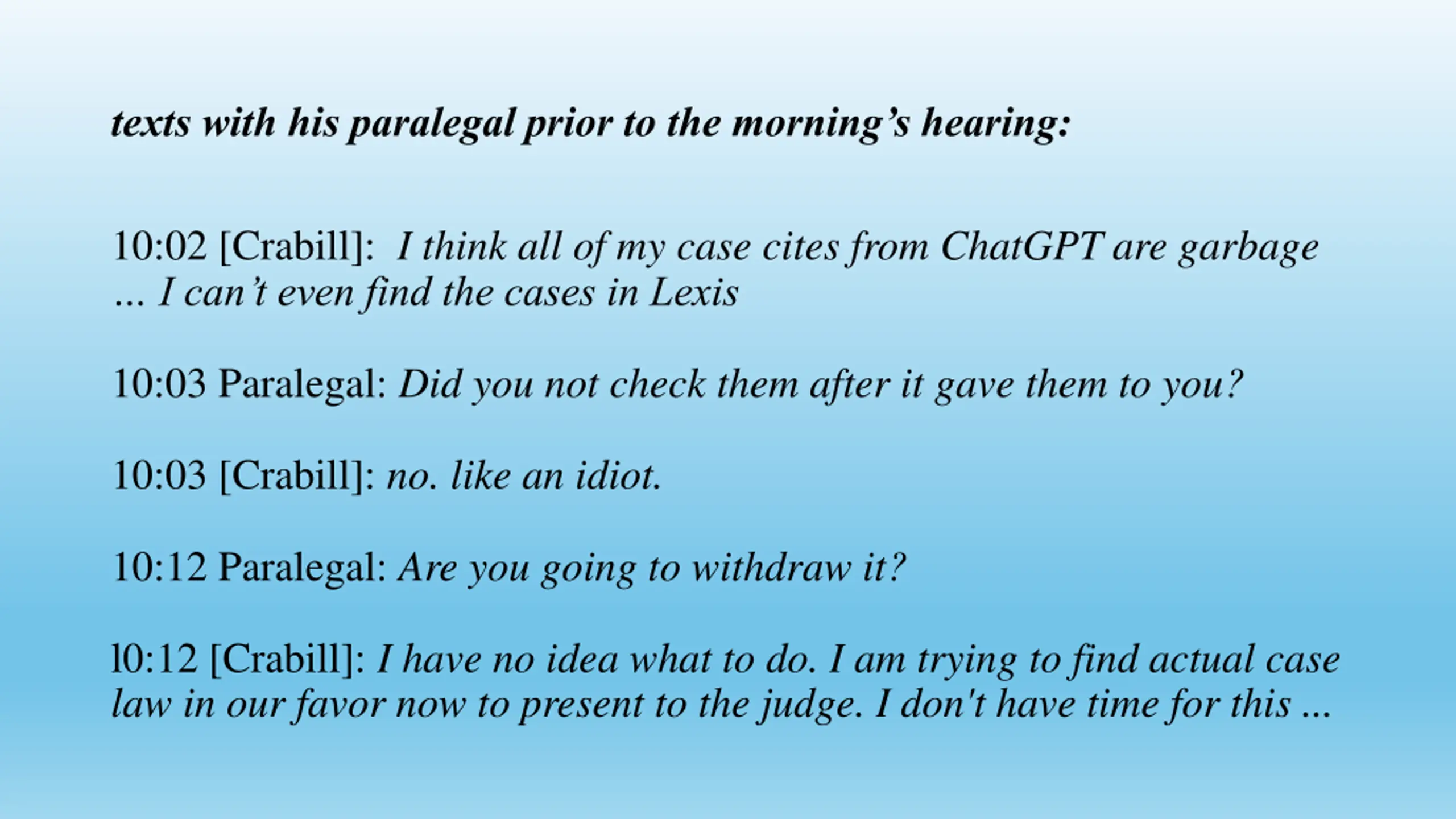 texts with his paralegal prior to the mornings hearing: 10:02 [Crabill]: I think all of my case cites from ChatGPT are garbage I can t even find the cases in Lexis 10:03 Paralegal: Did you not check them after it gave them to you? 10:03 [Crabill]: no. like an idiot. 10:12 Paralegal: Are you going to withdraw it? l0:12 [Crabill]: I have no idea what to do. I am trying to find actual case law in our favor now to present to the judge. I don't have time for this ...