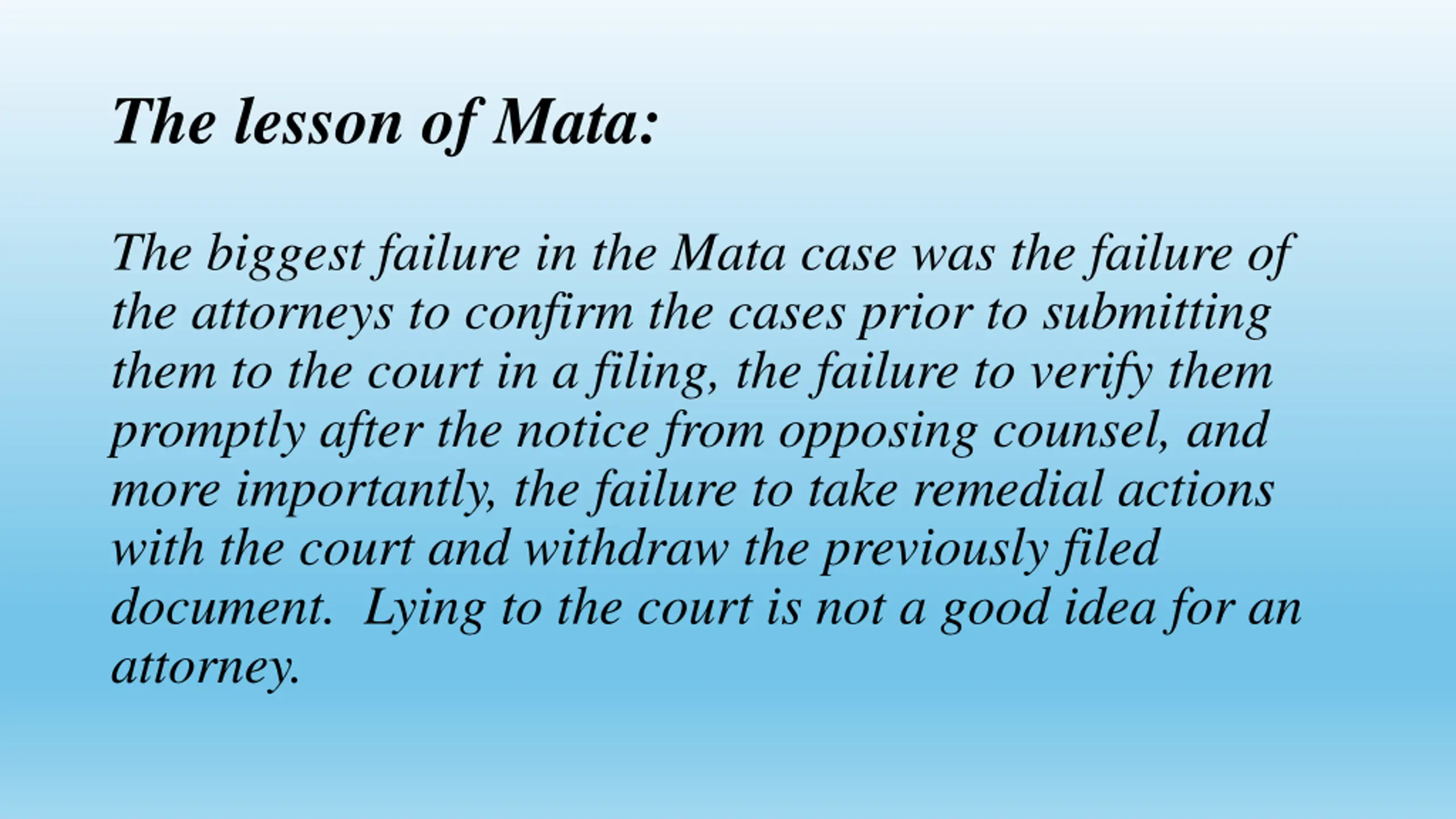 The lesson of Mata: The biggest failure in the Mata case was the failure of the attorneys to confirm the cases prior to submitting them to the court in a filing, the failure to verify them promptly after the notice from opposing counsel, and more importantly, the failure to take remedial actions with the court and withdraw the previously filed document. Lying to the court is not a good idea for an attorney.