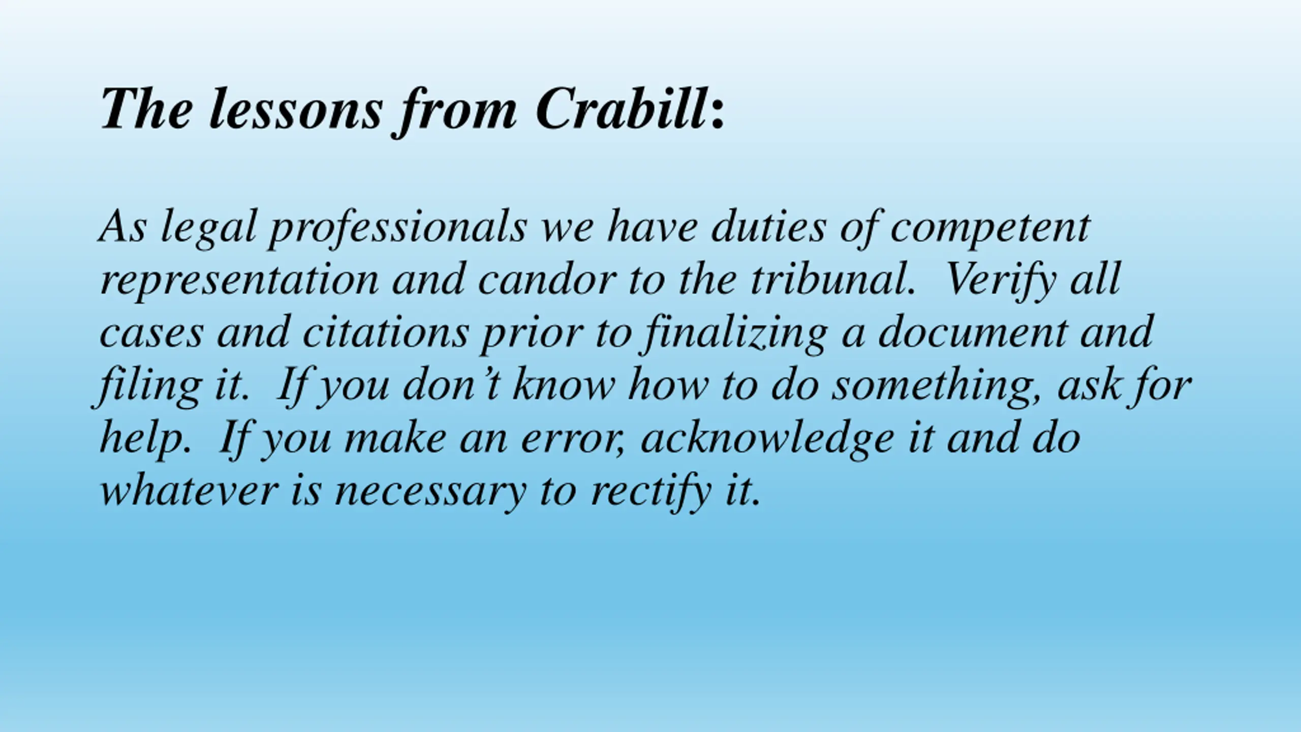 The lessons from Crabill: As legal professionals we have duties of competent representation and candor to the tribunal. Verify all cases and citations prior to finalizing a document and filing it. If you don t know how to do something, ask for help. If you make an error, acknowledge it and do whatever is necessary to rectify it.