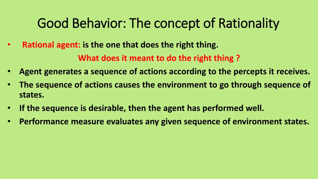 Good Behavior: The concept of Rationality Good Behavior: The concept of Rationality Rational agent: is the one that does the right thing. What does it meant to do the right thing ? Agent generates a sequence of actions according to the percepts it receives. The sequence of actions causes the environment to go through sequence of states. If the sequence is desirable, then the agent has performed well. Performance measure evaluates any given sequence of environment states.