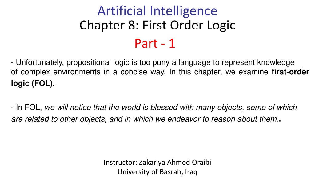 Artificial Intelligence Chapter 8: First Order Logic Part - 1 - Unfortunately, propositional logic is too puny a language to represent knowledge of complex environments in a concise way. In this chapter, we examine first-order logic (FOL). - In FOL, we will notice that the world is blessed with many objects, some of which are related to other objects, and in which we endeavor to reason about them.. Instructor: Zakariya Ahmed Oraibi University of Basrah, Iraq
