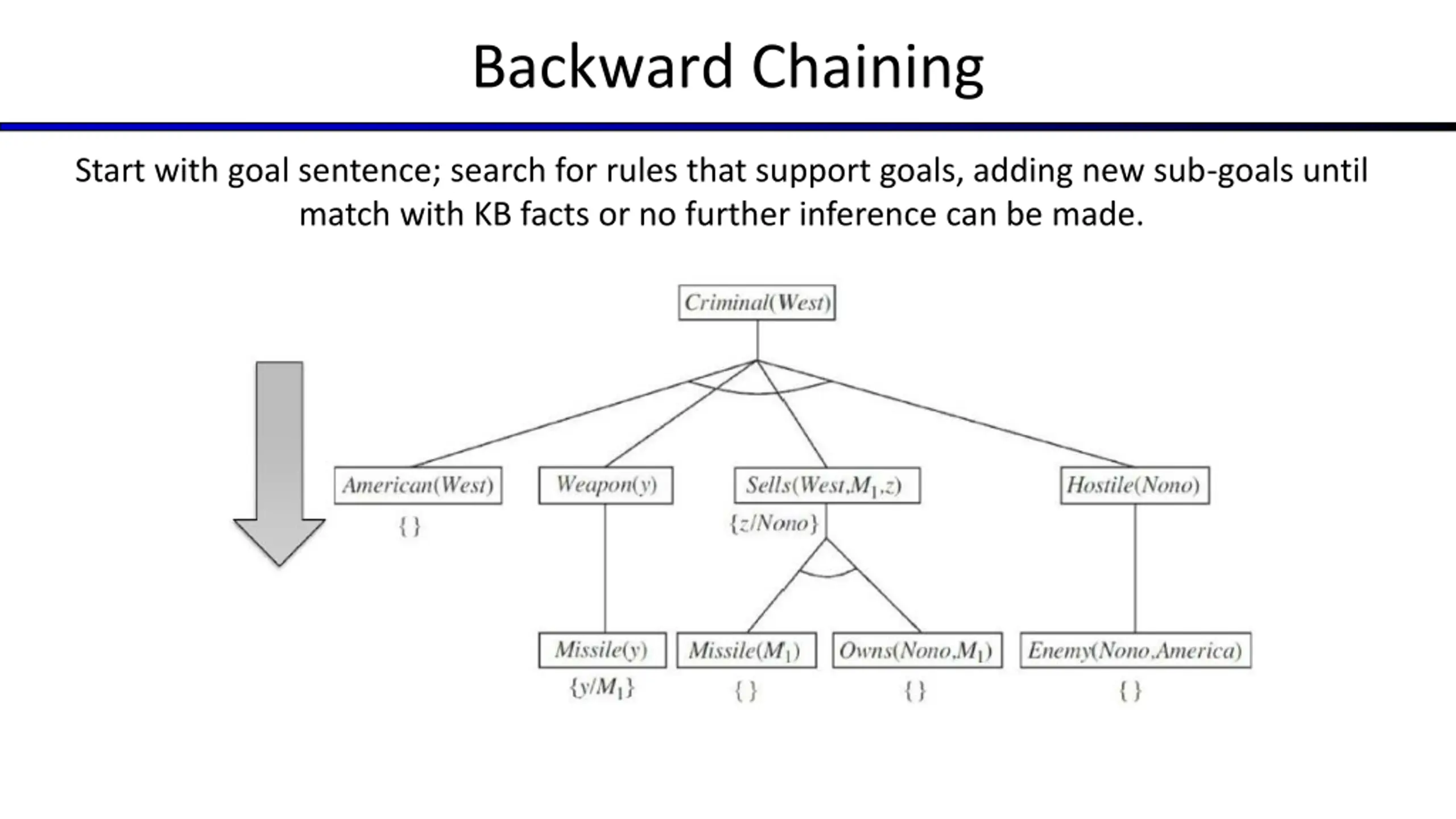 Backward Chaining Start with goal sentence; search for rules that support goals, adding new sub-goals until match with KB facts or no further inference can be made.