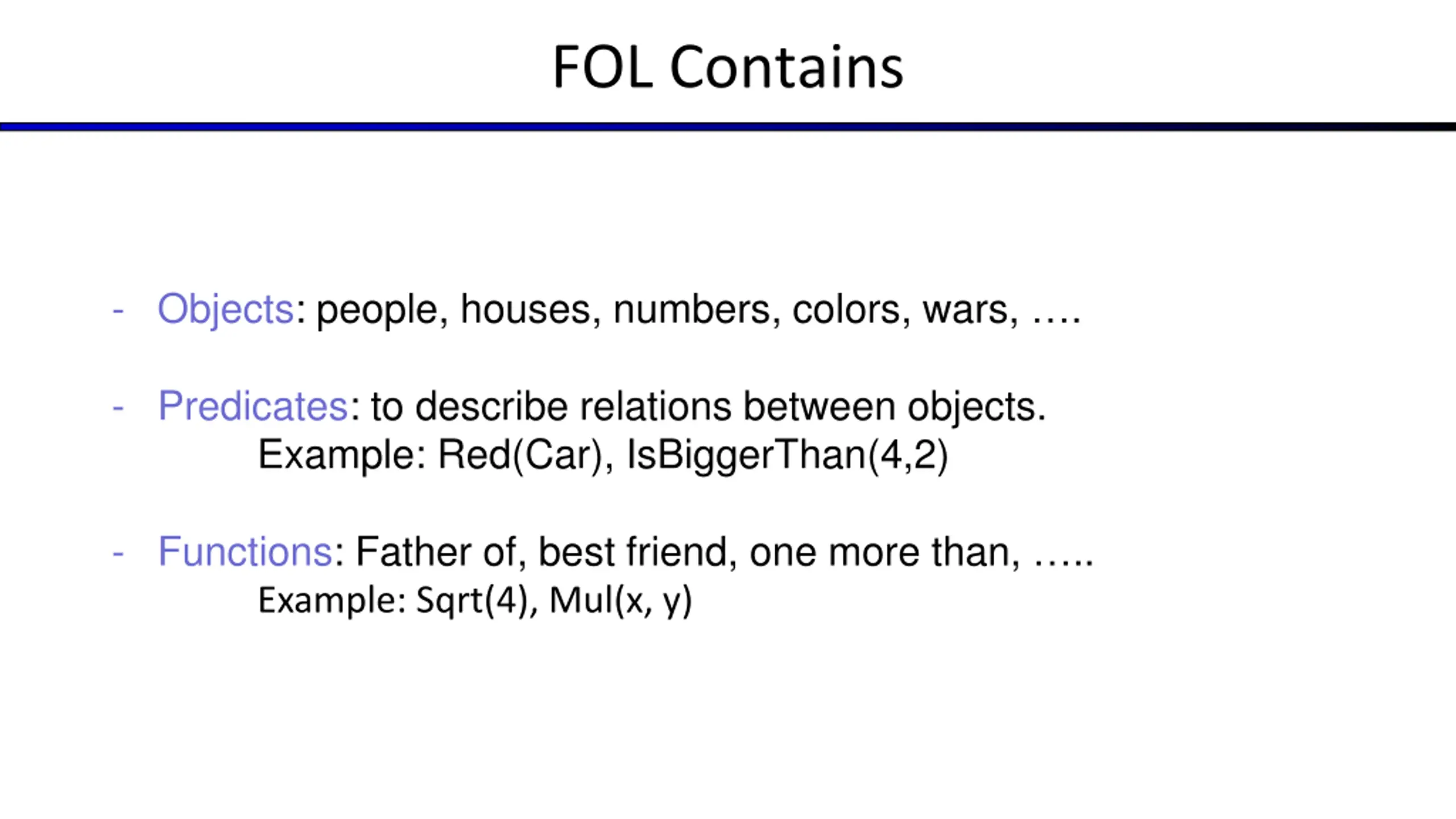FOL Contains - Objects: people, houses, numbers, colors, wars, . - Predicates: to describe relations between objects. Example: Red(Car), IsBiggerThan(4,2) - Functions: Father of, best friend, one more than, .. Example: Sqrt(4), Mul(x, y)