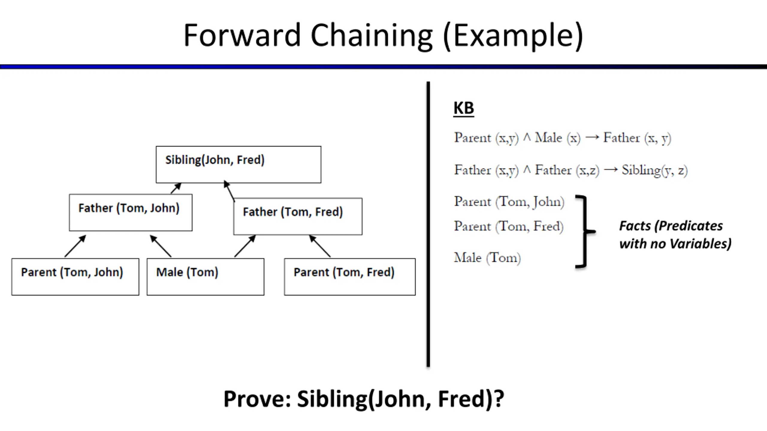 Forward Chaining (Example) KB Facts (Predicates with no Variables) Prove: Sibling(John, Fred)?