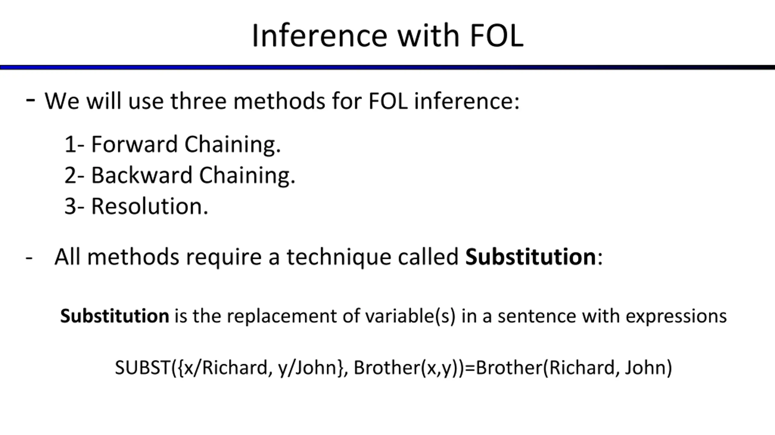 Inference with FOL - We will use three methods for FOL inference: 1- Forward Chaining. 2- Backward Chaining. 3- Resolution. - All methods require a technique called Substitution: Substitution is the replacement of variable(s) in a sentence with expressions SUBST({x/Richard, y/John}, Brother(x,y))=Brother(Richard, John)