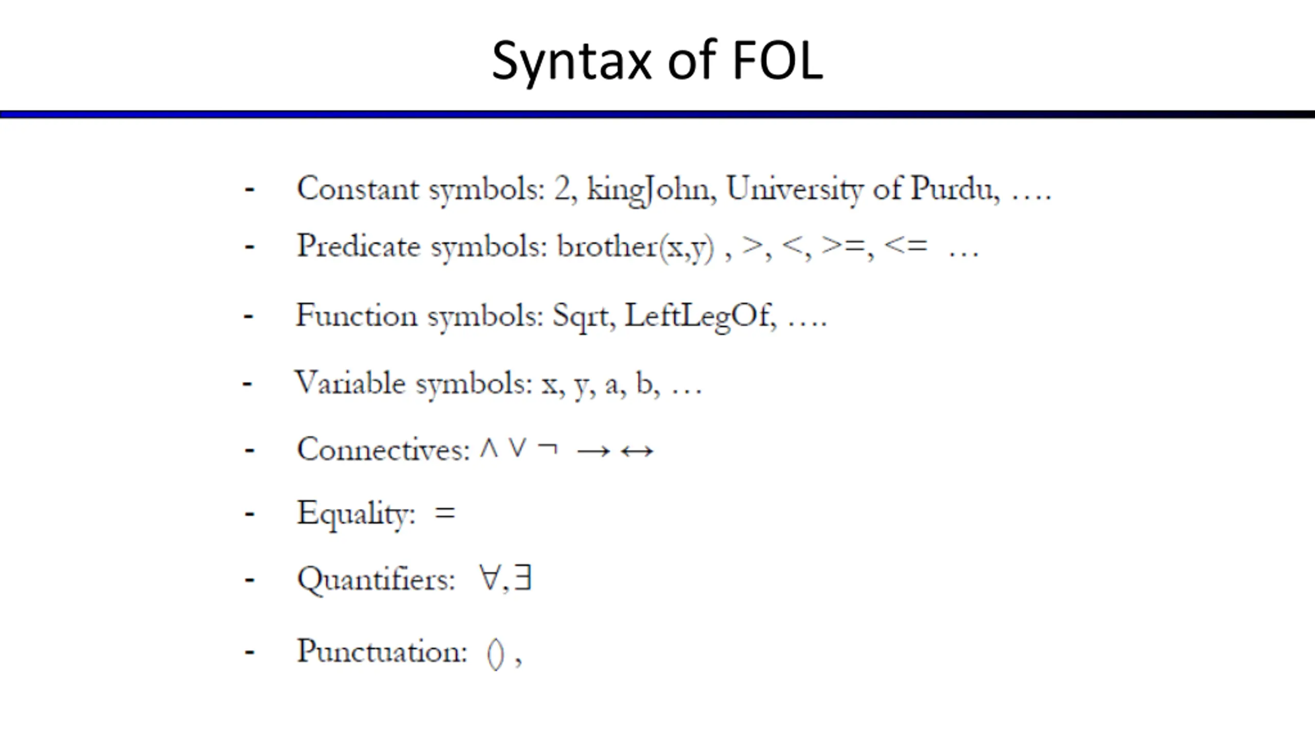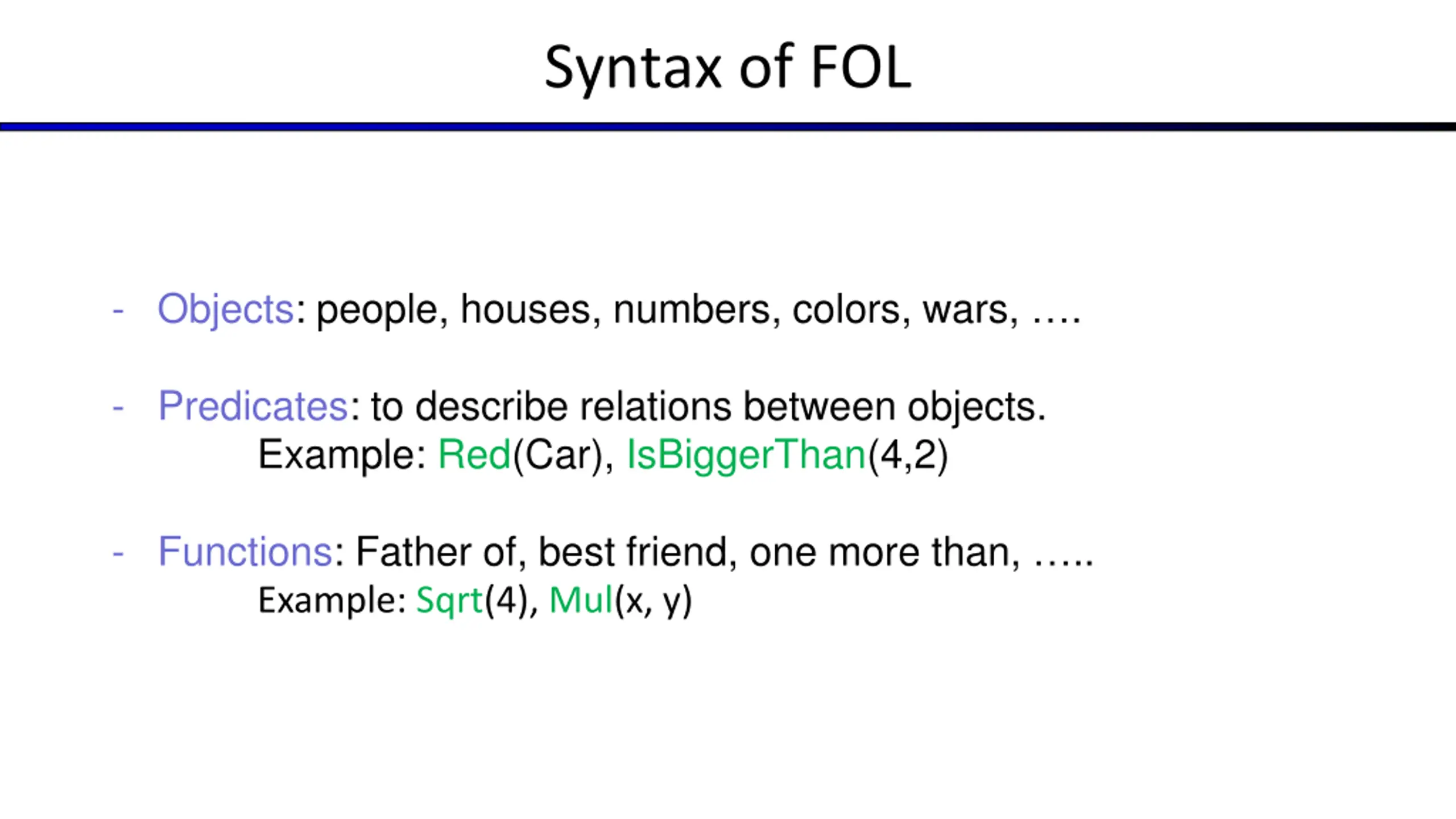 Syntax of FOL - Objects: people, houses, numbers, colors, wars, . - Predicates: to describe relations between objects. Example: Red(Car), IsBiggerThan(4,2) - Functions: Father of, best friend, one more than, .. Example: Sqrt(4), Mul(x, y)