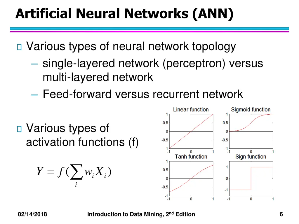 Artificial Neural Networks (ANN) Various types of neural network topology single-layered network (perceptron) versus multi-layered network Feed-forward versus recurrent network Various types of activation functions (f) ( = ) Y f w iX i i 02/14/2018 Introduction to Data Mining, 2nd Edition 6