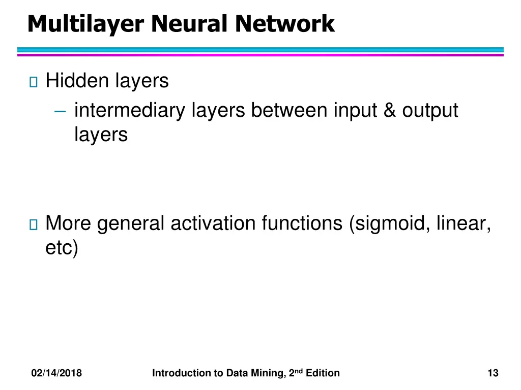 Multilayer Neural Network Hidden layers intermediary layers between input & output layers More general activation functions (sigmoid, linear, etc) 02/14/2018 Introduction to Data Mining, 2nd Edition 13