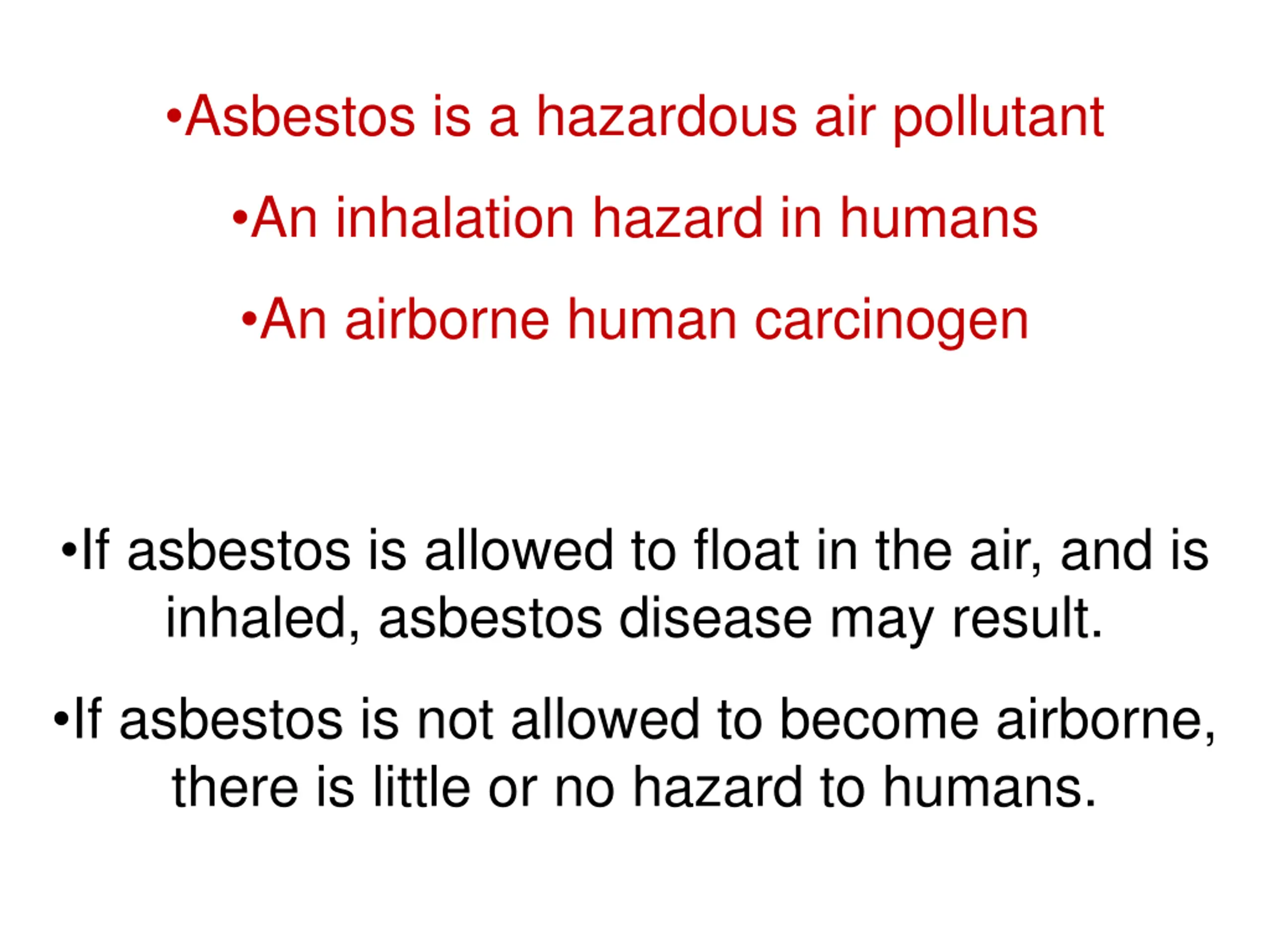 Asbestos is a hazardous air pollutant An inhalation hazard in humans An airborne human carcinogen If asbestos is allowed to float in the air, and is inhaled, asbestos disease may result. If asbestos is not allowed to become airborne, there is little or no hazard to humans.