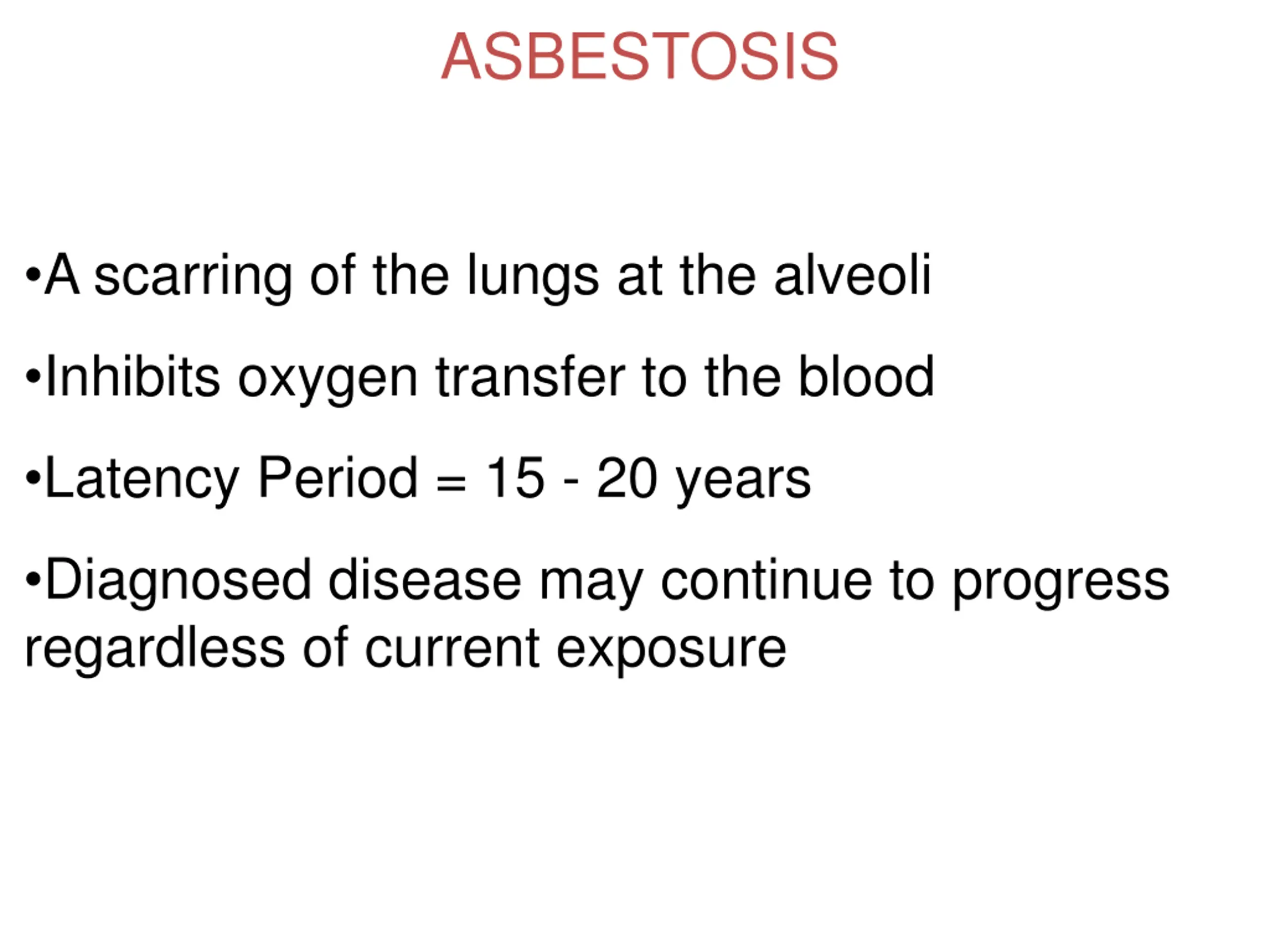 ASBESTOSIS A scarring of the lungs at the alveoli Inhibits oxygen transfer to the blood Latency Period = 15 - 20 years Diagnosed disease may continue to progress regardless of current exposure