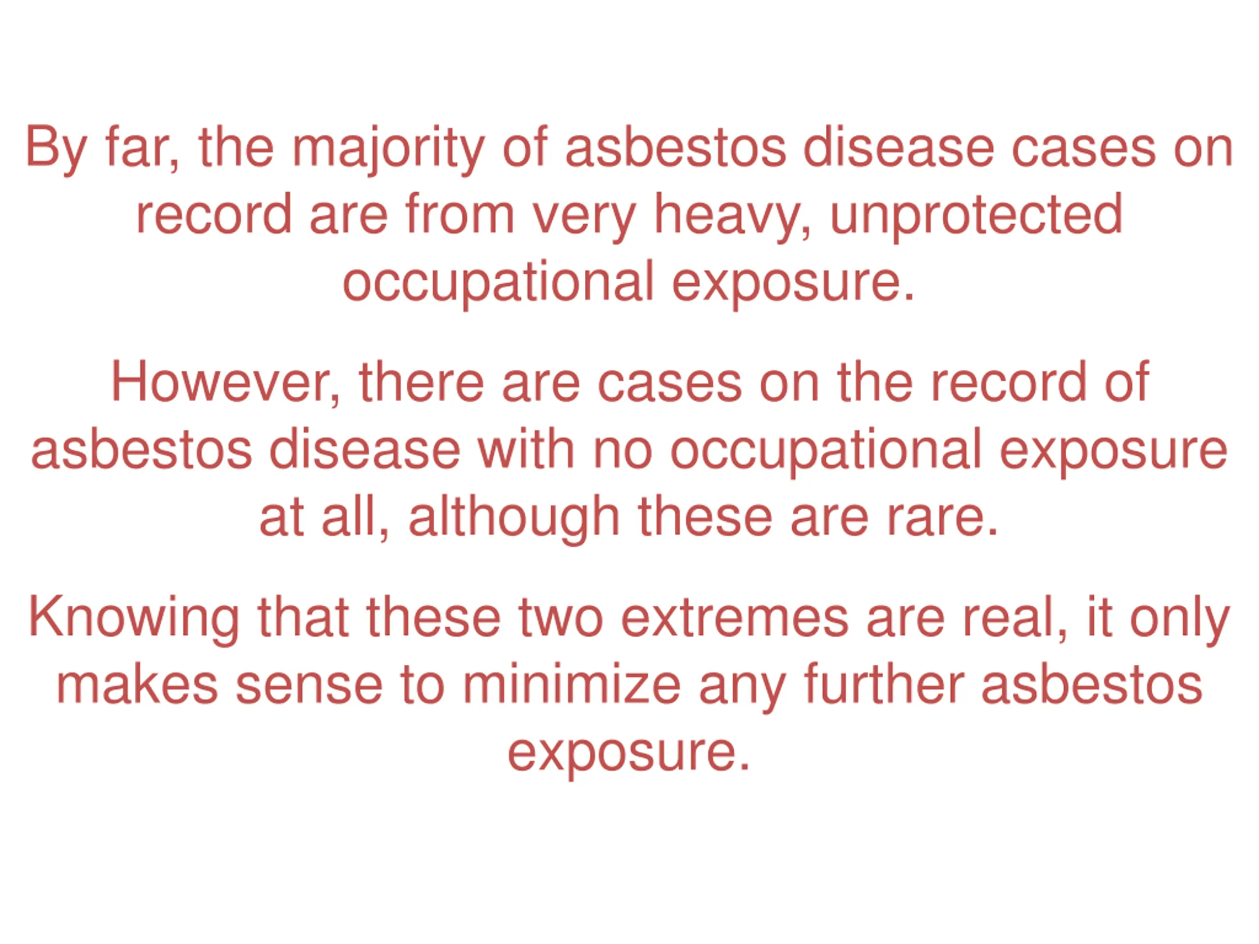 By far, the majority of asbestos disease cases on record are from very heavy, unprotected occupational exposure. However, there are cases on the record of asbestos disease with no occupational exposure at all, although these are rare. Knowing that these two extremes are real, it only makes sense to minimize any further asbestos exposure.