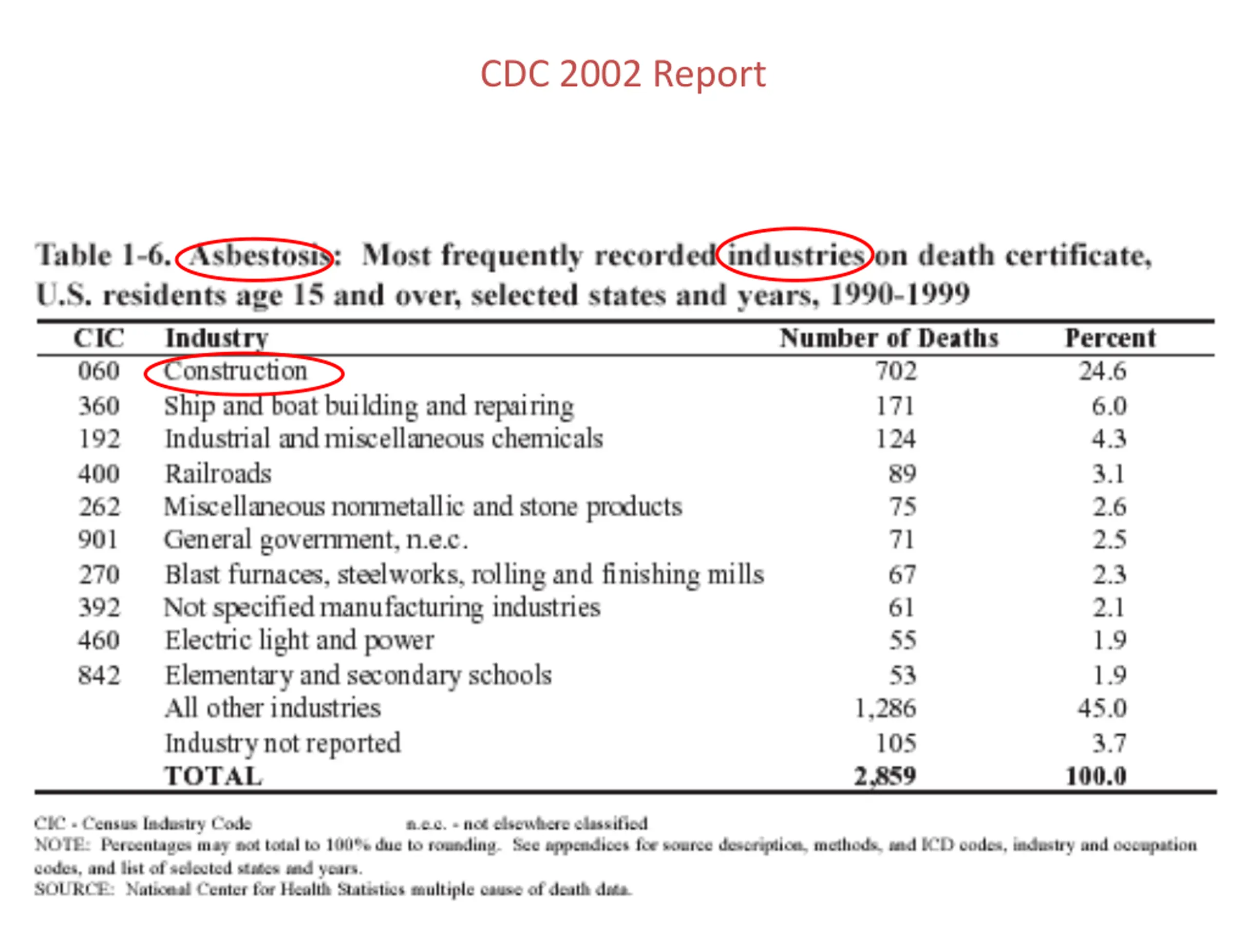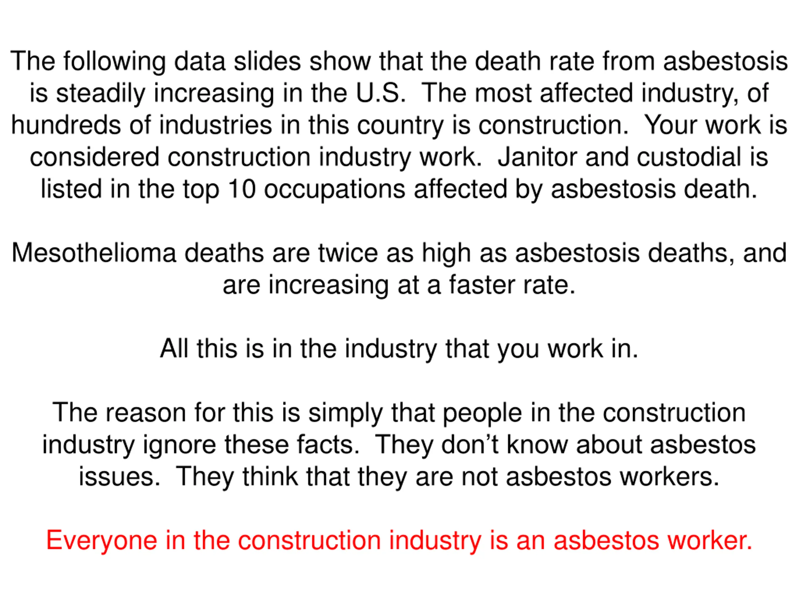 The following data slides show that the death rate from asbestosis is steadily increasing in the U.S. The most affected industry, of hundreds of industries in this country is construction. Your work is considered construction industry work. Janitor and custodial is listed in the top 10 occupations affected by asbestosis death. Mesothelioma deaths are twice as high as asbestosis deaths, and are increasing at a faster rate. All this is in the industry that you work in. The reason for this is simply that people in the construction industry ignore these facts. They don t know about asbestos issues. They think that they are not asbestos workers. Everyone in the construction industry is an asbestos worker.