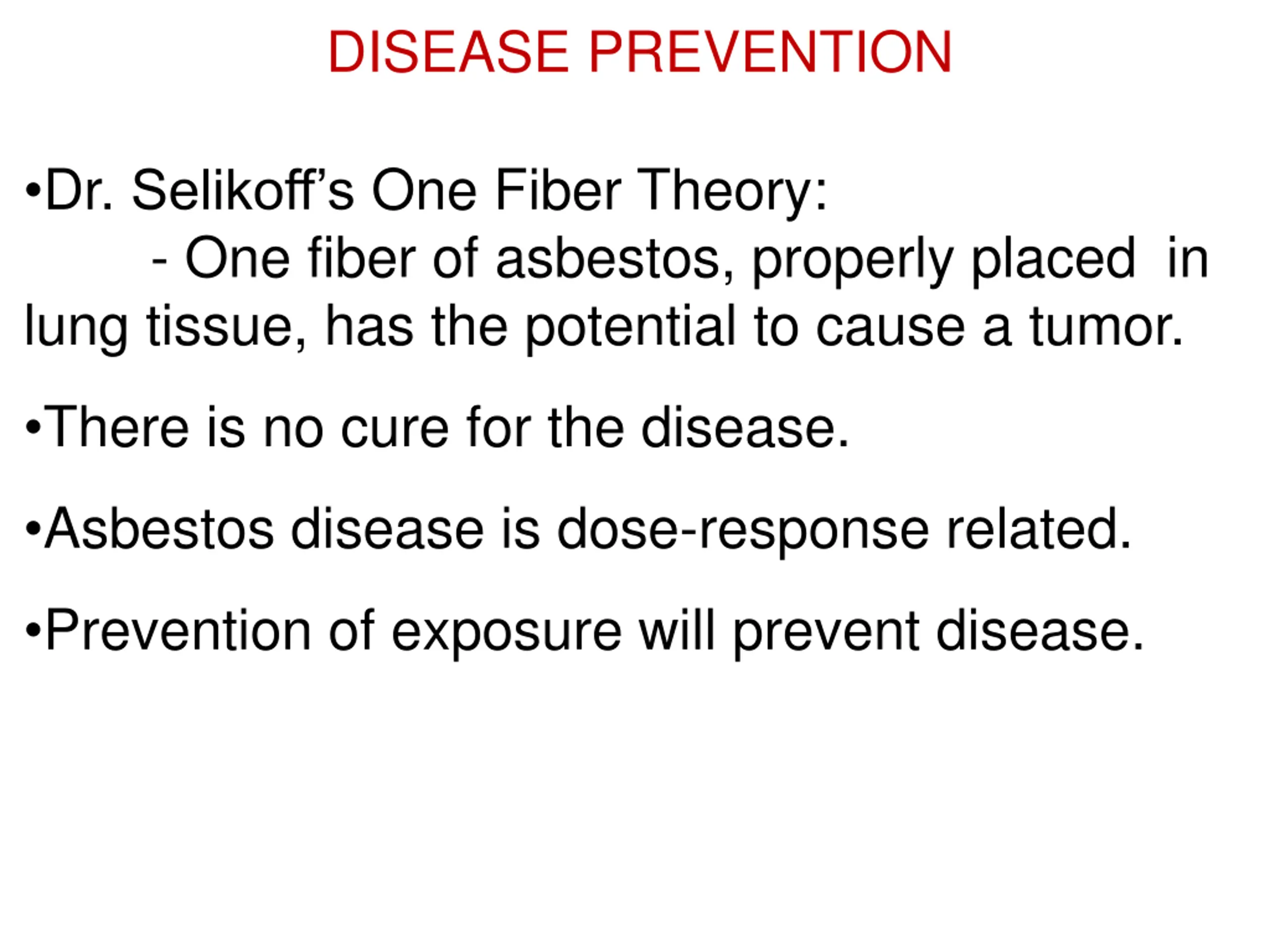 DISEASE PREVENTION Dr. Selikoff s One Fiber Theory: - One fiber of asbestos, properly placed in lung tissue, has the potential to cause a tumor. There is no cure for the disease. Asbestos disease is dose-response related. Prevention of exposure will prevent disease.