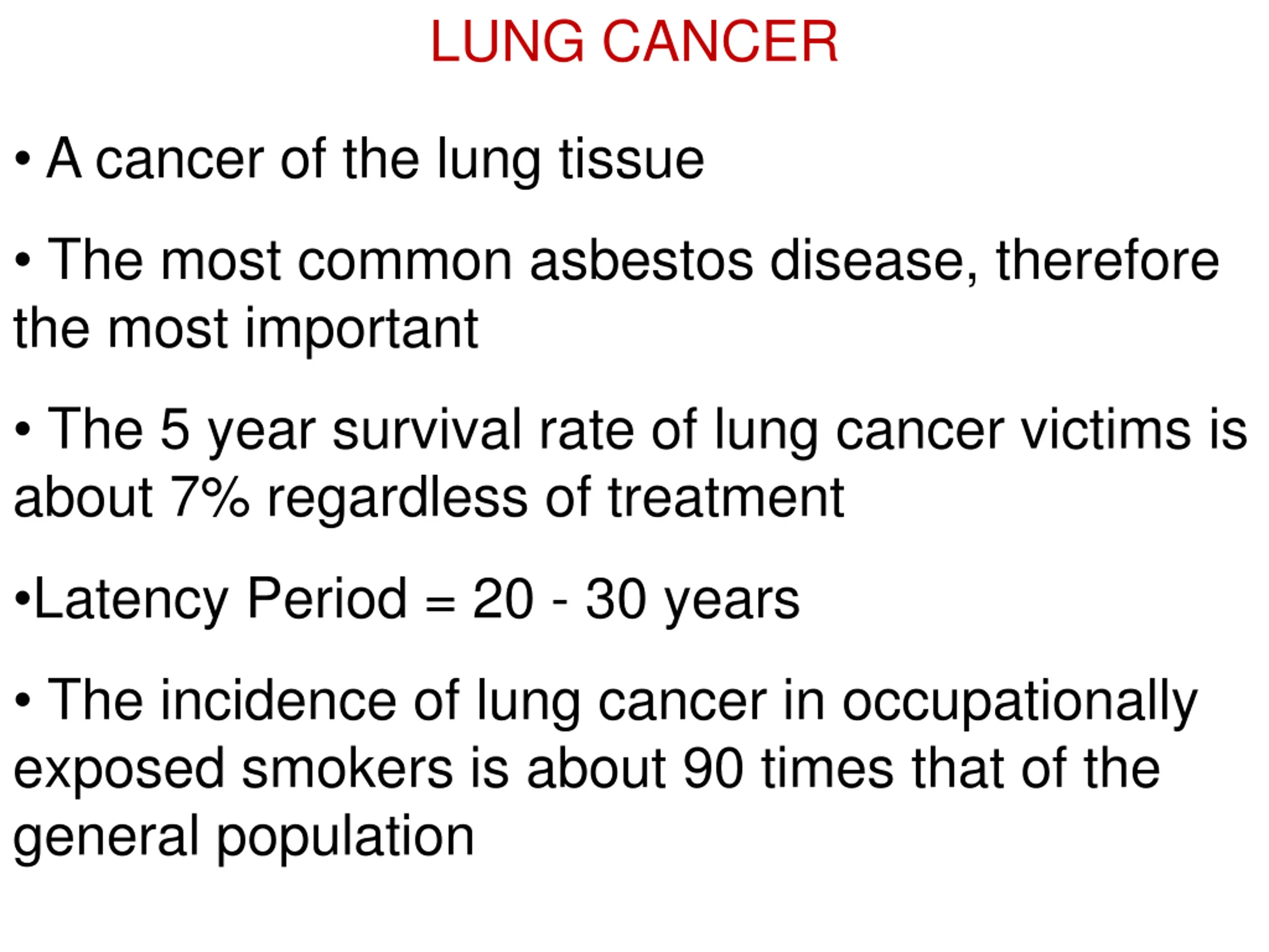 LUNG CANCER A cancer of the lung tissue The most common asbestos disease, therefore the most important The 5 year survival rate of lung cancer victims is about 7% regardless of treatment Latency Period = 20 - 30 years The incidence of lung cancer in occupationally exposed smokers is about 90 times that of the general population