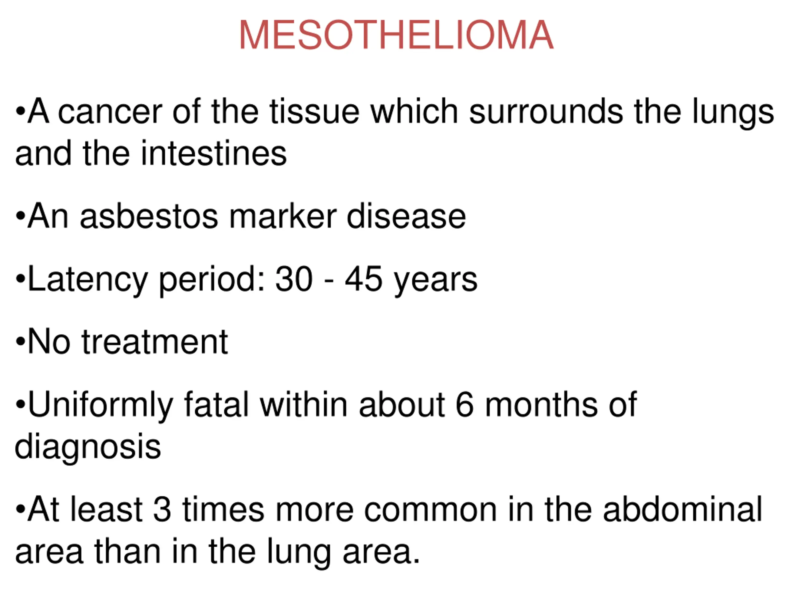 MESOTHELIOMA A cancer of the tissue which surrounds the lungs and the intestines An asbestos marker disease Latency period: 30 - 45 years No treatment Uniformly fatal within about 6 months of diagnosis At least 3 times more common in the abdominal area than in the lung area.