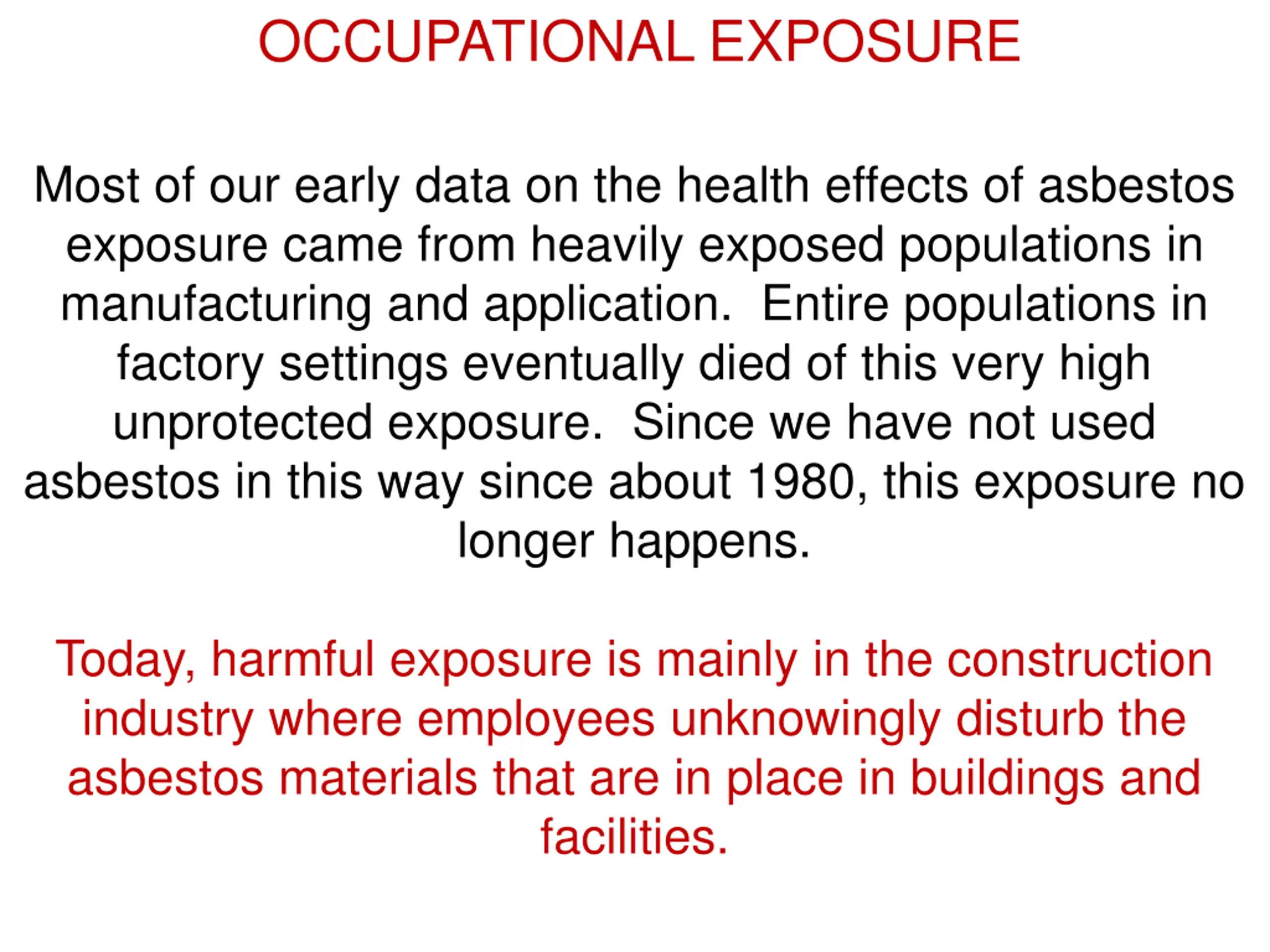 OCCUPATIONAL EXPOSURE Most of our early data on the health effects of asbestos exposure came from heavily exposed populations in manufacturing and application. Entire populations in factory settings eventually died of this very high unprotected exposure. Since we have not used asbestos in this way since about 1980, this exposure no longer happens. Today, harmful exposure is mainly in the construction industry where employees unknowingly disturb the asbestos materials that are in place in buildings and facilities.
