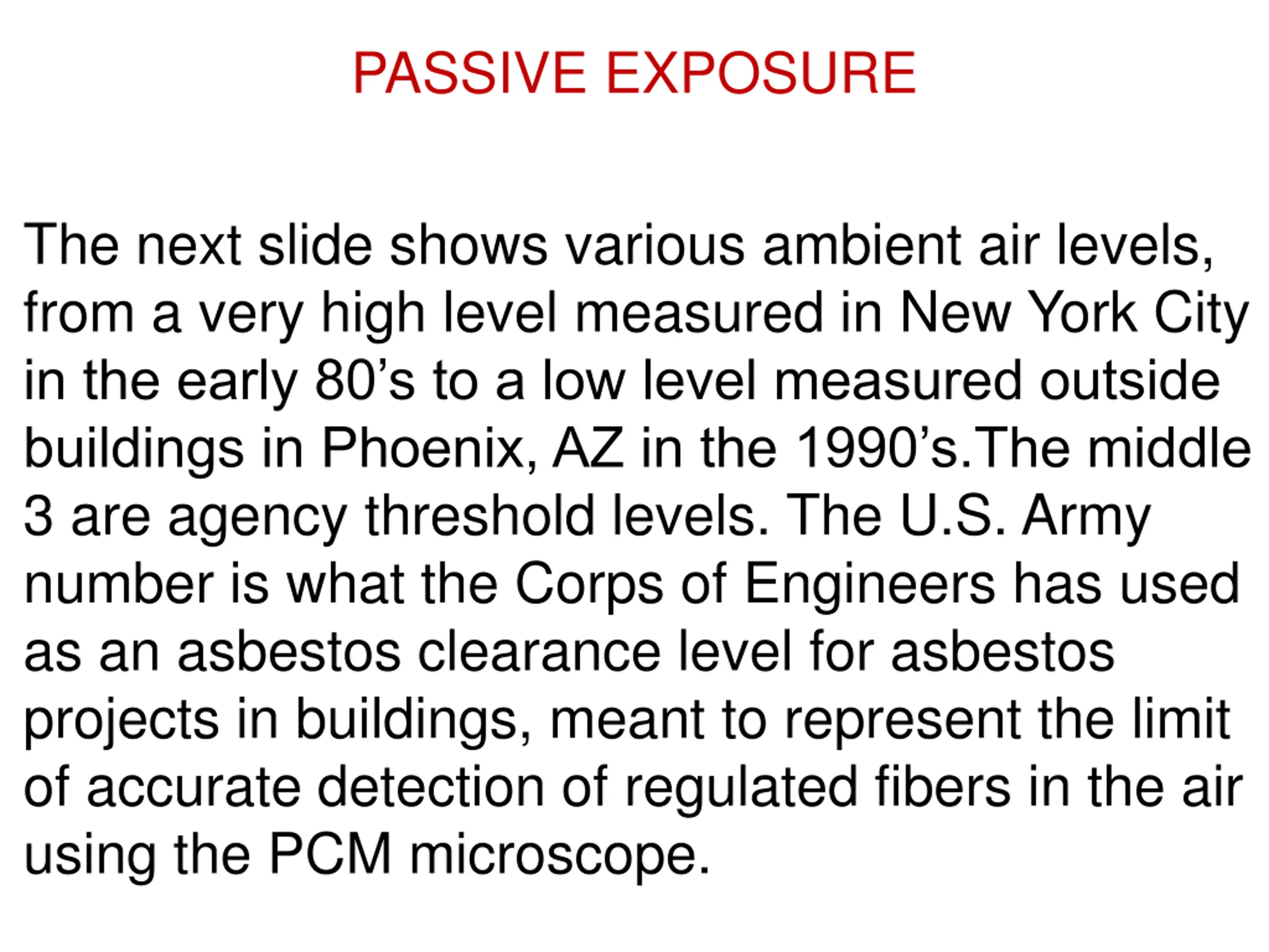 PASSIVE EXPOSURE The next slide shows various ambient air levels, from a very high level measured in New York City in the early 80 s to a low level measured outside buildings in Phoenix, AZ in the 1990 s.The middle 3 are agency threshold levels. The U.S. Army number is what the Corps of Engineers has used as an asbestos clearance level for asbestos projects in buildings, meant to represent the limit of accurate detection of regulated fibers in the air using the PCM microscope.