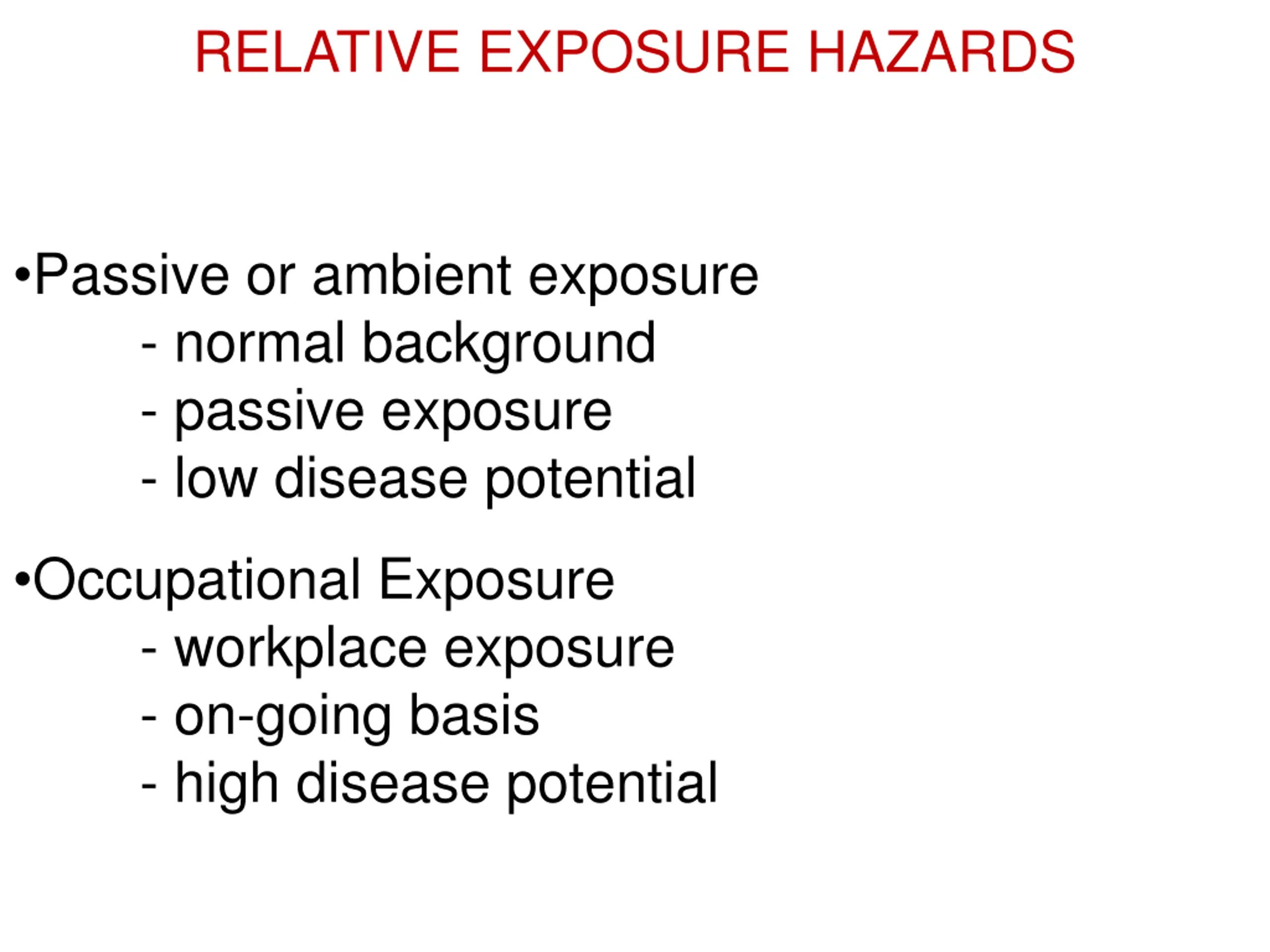 RELATIVE EXPOSURE HAZARDS Passive or ambient exposure - normal background - passive exposure - low disease potential Occupational Exposure - workplace exposure - on-going basis - high disease potential