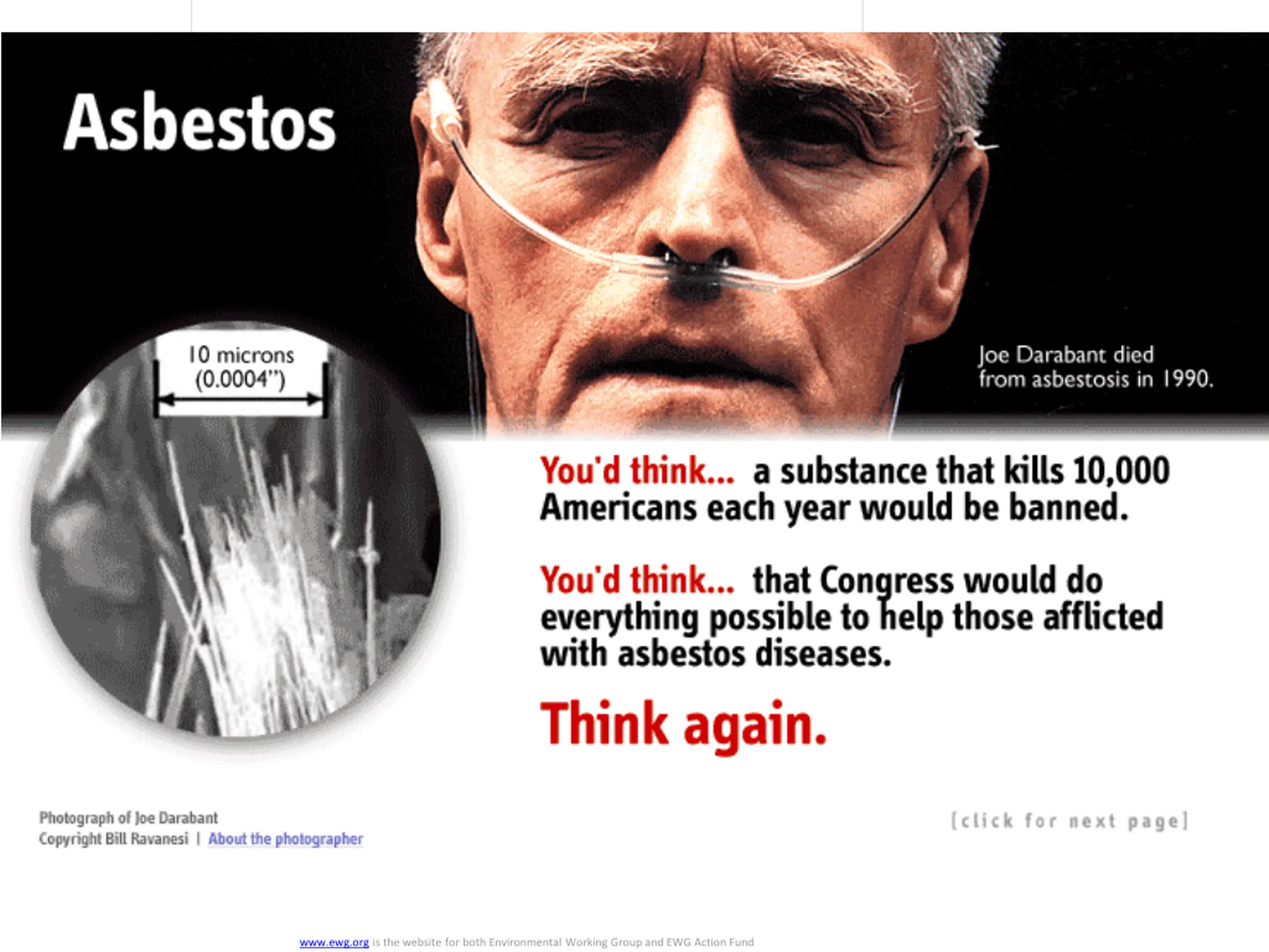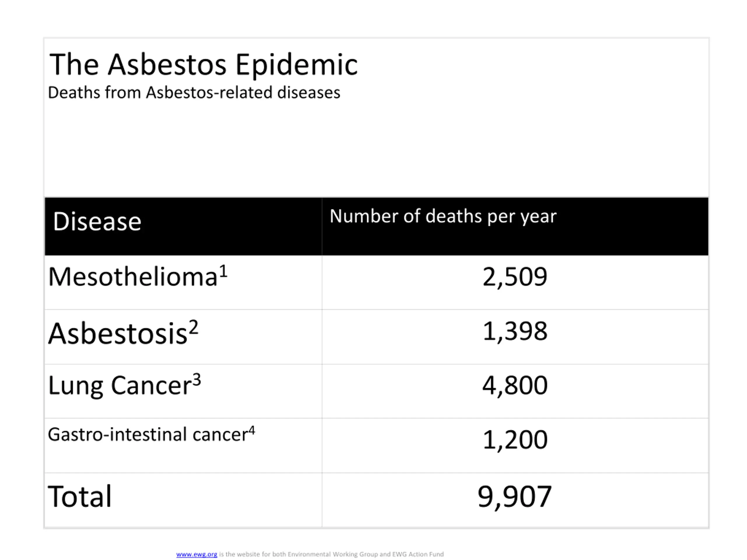 The Asbestos Epidemic Deaths from Asbestos-related diseases Number of deaths per year Disease Mesothelioma1 2,509 Asbestosis2 1,398 Lung Cancer3 4,800 Gastro-intestinal cancer4 1,200 Total 9,907 www.ewg.org is the website for both Environmental Working Group and EWG Action Fund
