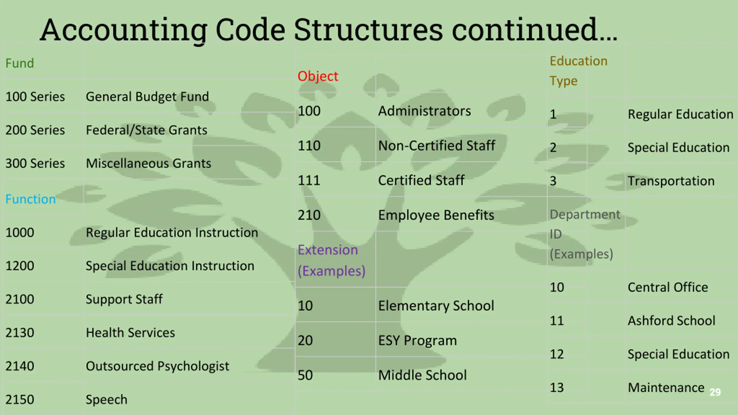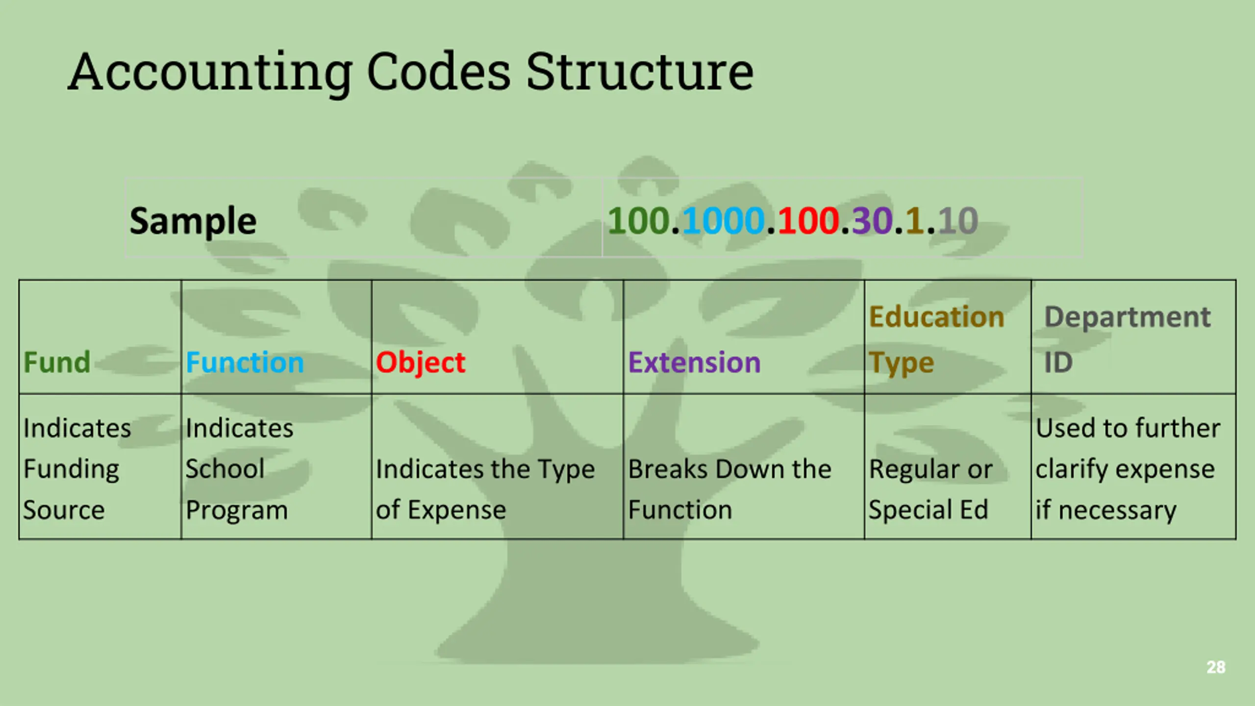 Accounting Codes Structure Sample 100.1000.100.30.1.10 Education Type Department ID Fund Function Object Extension Indicates Funding Source Indicates School Program Used to further clarify expense if necessary Indicates the Type of Expense Breaks Down the Function Regular or Special Ed 28
