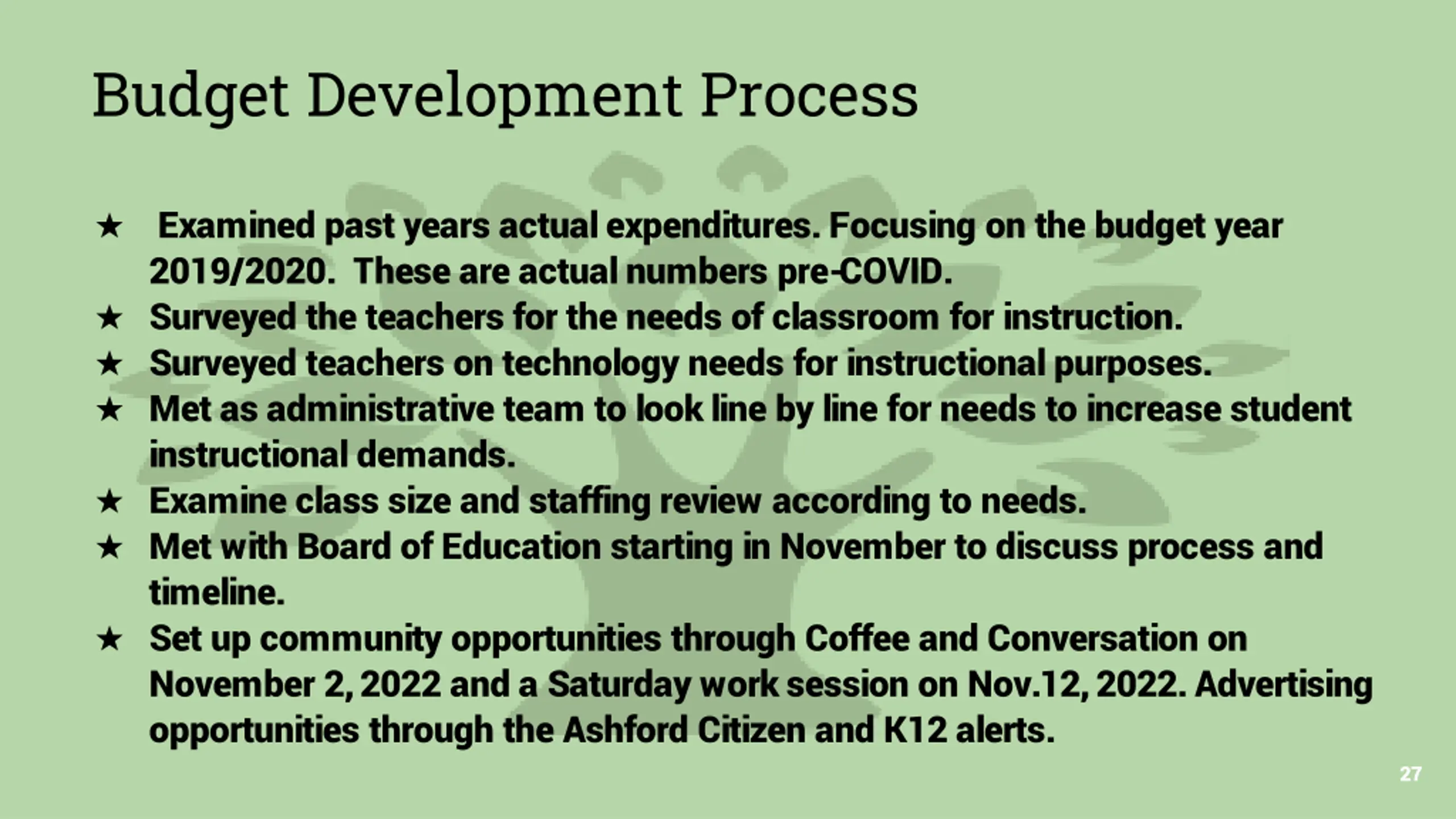 Budget Development Process Examined past years actual expenditures. Focusing on the budget year 2019/2020. These are actual numbers pre-COVID. Surveyed the teachers for the needs of classroom for instruction. Surveyed teachers on technology needs for instructional purposes. Met as administrative team to look line by line for needs to increase student instructional demands. Examine class size and staffing review according to needs. Met with Board of Education starting in November to discuss process and timeline. Set up community opportunities through Coffee and Conversation on November 2, 2022 and a Saturday work session on Nov.12, 2022. Advertising opportunities through the Ashford Citizen and K12 alerts. 27