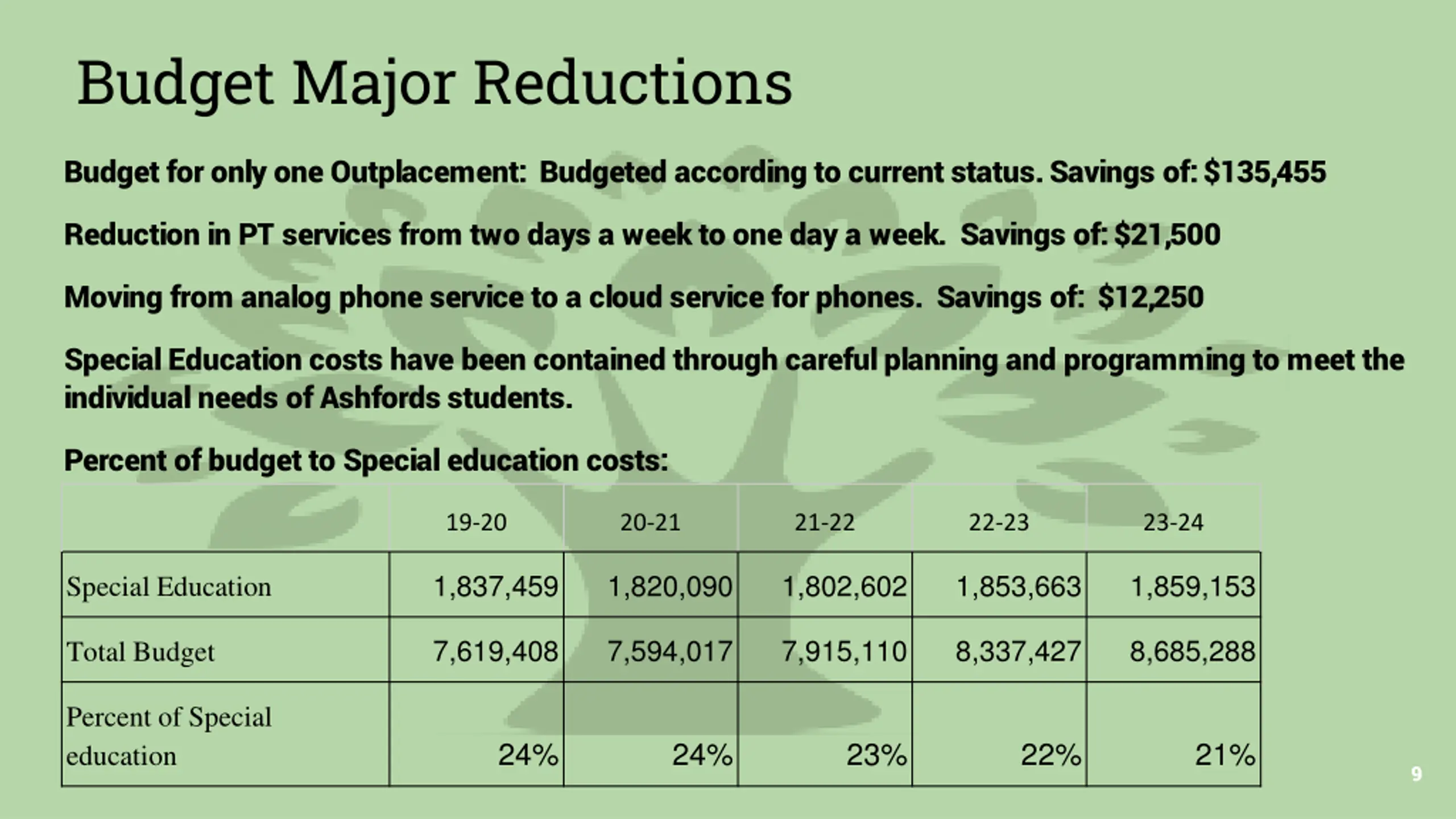 Budget Major Reductions Budget for only one Outplacement: Budgeted according to current status. Savings of: $135,455 Reduction in PT services from two days a week to one day a week. Savings of: $21,500 Moving from analog phone service to a cloud service for phones. Savings of: $12,250 Special Education costs have been contained through careful planning and programming to meet the individual needs of Ashfords students. Percent of budget to Special education costs: 19-20 20-21 21-22 22-23 23-24 1,837,459 1,820,090 1,802,602 1,853,663 1,859,153 Special Education 7,619,408 7,594,017 7,915,110 8,337,427 8,685,288 Total Budget Percent of Special education 24% 24% 23% 22% 21% 9