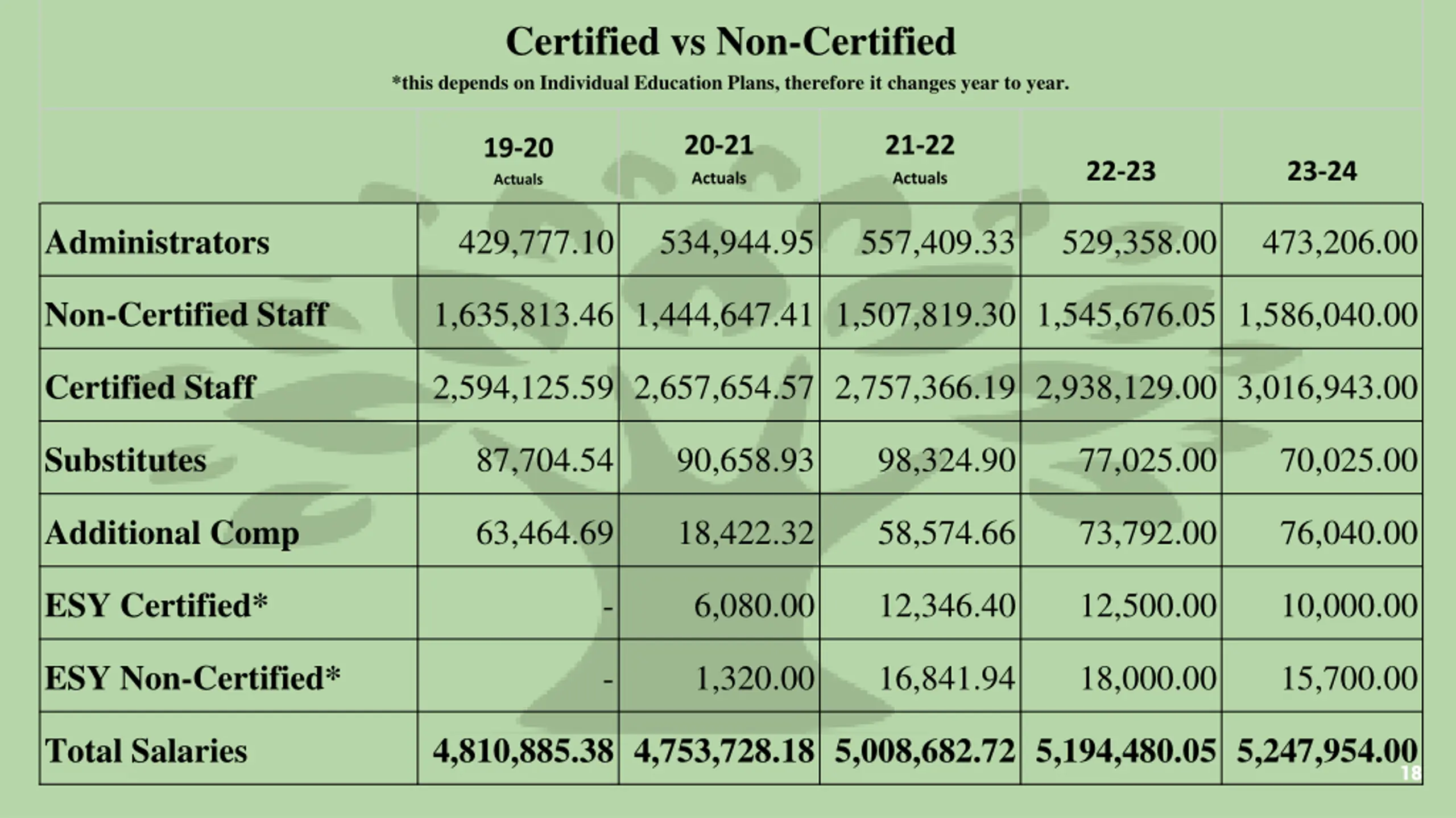 Certified vs Non-Certified *this depends on Individual Education Plans, therefore it changes year to year. 20-21 Actuals 21-22 Actuals 19-20 Actuals 22-23 23-24 Administrators 429,777.10 534,944.95 557,409.33 529,358.00 473,206.00 Non-Certified Staff 1,635,813.46 1,444,647.41 1,507,819.30 1,545,676.05 1,586,040.00 Certified Staff 2,594,125.59 2,657,654.57 2,757,366.19 2,938,129.00 3,016,943.00 Substitutes 87,704.54 90,658.93 98,324.90 77,025.00 70,025.00 Additional Comp 63,464.69 18,422.32 58,574.66 73,792.00 76,040.00 ESY Certified* - 6,080.00 12,346.40 12,500.00 10,000.00 ESY Non-Certified* - 1,320.00 16,841.94 18,000.00 15,700.00 Total Salaries 4,810,885.38 4,753,728.18 5,008,682.72 5,194,480.05 5,247,954.00 18