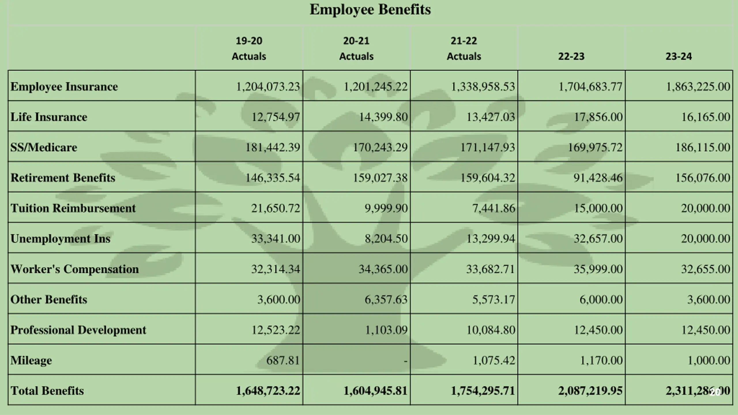 Employee Benefits 19-20 Actuals 20-21 Actuals 21-22 Actuals 22-23 23-24 Employee Insurance 1,204,073.23 1,201,245.22 1,338,958.53 1,704,683.77 1,863,225.00 Life Insurance 12,754.97 14,399.80 13,427.03 17,856.00 16,165.00 SS/Medicare 181,442.39 170,243.29 171,147.93 169,975.72 186,115.00 Retirement Benefits 146,335.54 159,027.38 159,604.32 91,428.46 156,076.00 Tuition Reimbursement 21,650.72 9,999.90 7,441.86 15,000.00 20,000.00 Unemployment Ins 33,341.00 8,204.50 13,299.94 32,657.00 20,000.00 Worker's Compensation 32,314.34 34,365.00 33,682.71 35,999.00 32,655.00 Other Benefits 3,600.00 6,357.63 5,573.17 6,000.00 3,600.00 Professional Development 12,523.22 1,103.09 10,084.80 12,450.00 12,450.00 Mileage 687.81 - 1,075.42 1,170.00 1,000.00 Total Benefits 1,648,723.22 1,604,945.81 1,754,295.71 2,087,219.95 2,311,286.00 20