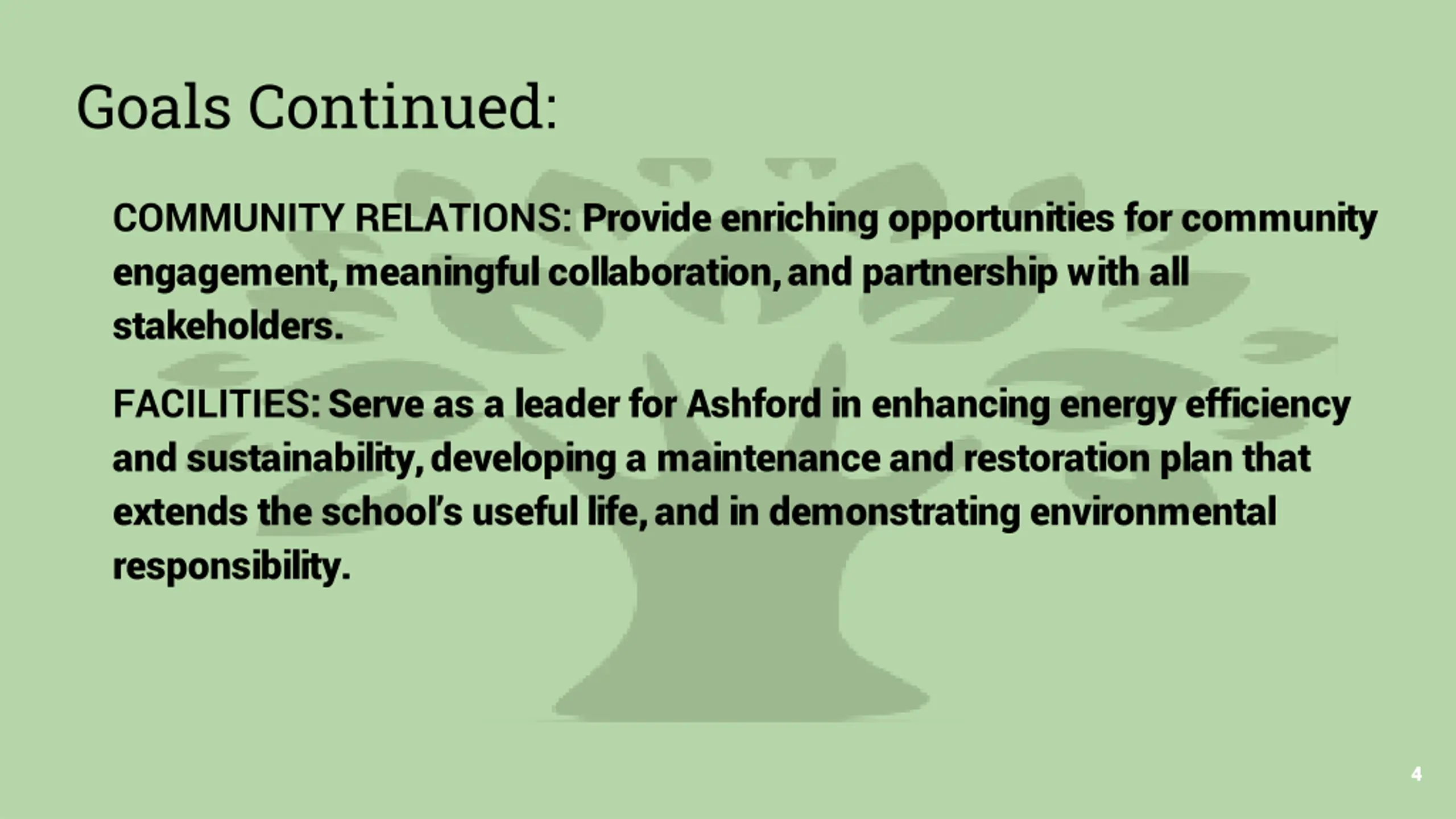 Goals Continued: COMMUNITY RELATIONS: Provide enriching opportunities for community engagement, meaningful collaboration, and partnership with all stakeholders. FACILITIES: Serve as a leader for Ashford in enhancing energy efficiency and sustainability, developing a maintenance and restoration plan that extends the school s useful life, and in demonstrating environmental responsibility. 4