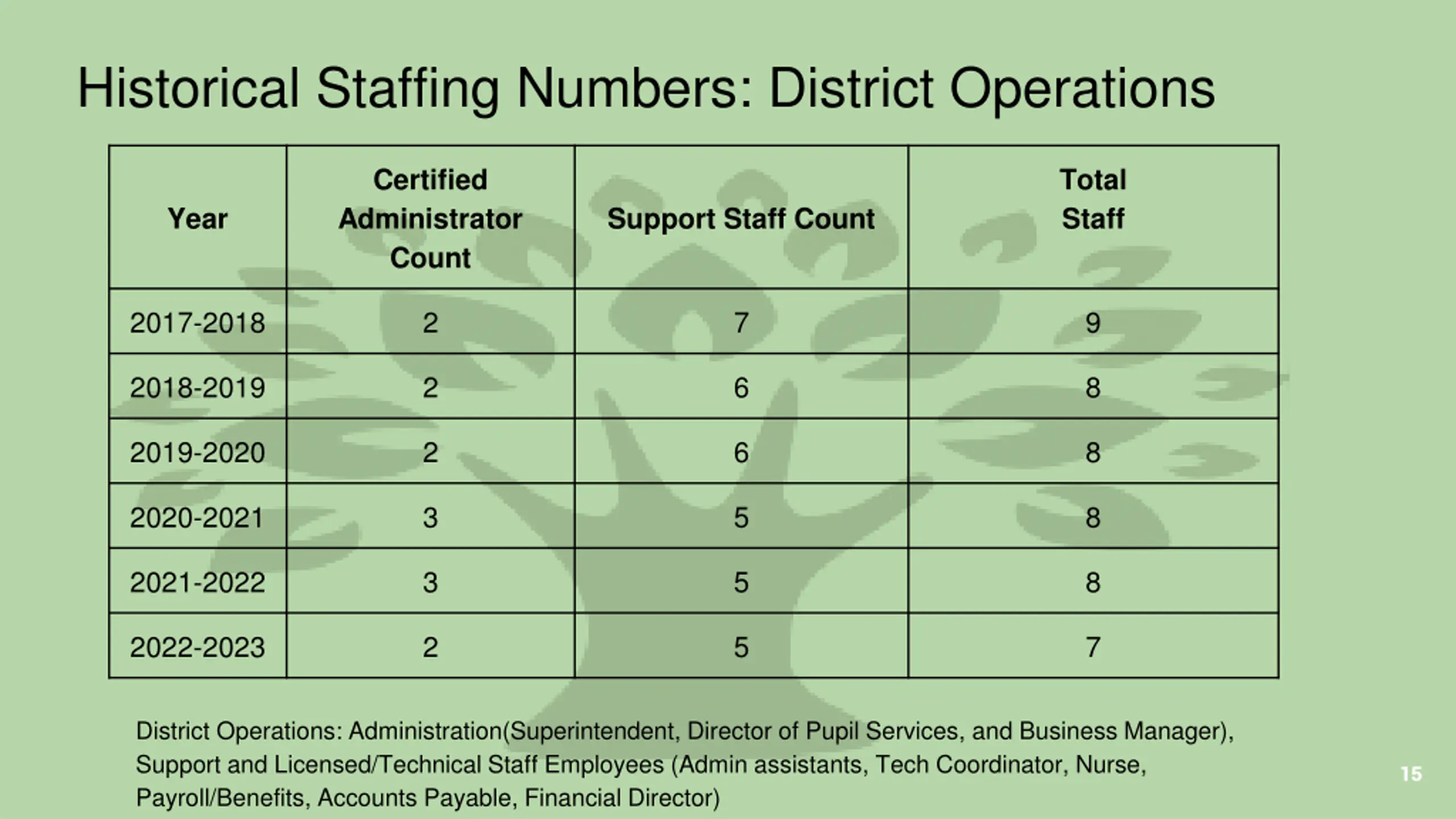 Historical Staffing Numbers: District Operations Certified Administrator Count Total Staff Year Support Staff Count 2017-2018 2 7 9 2018-2019 2 6 8 2019-2020 2 6 8 2020-2021 3 5 8 2021-2022 3 5 8 2022-2023 2 5 7 District Operations: Administration(Superintendent, Director of Pupil Services, and Business Manager), Support and Licensed/Technical Staff Employees (Admin assistants, Tech Coordinator, Nurse, Payroll/Benefits, Accounts Payable, Financial Director) 15