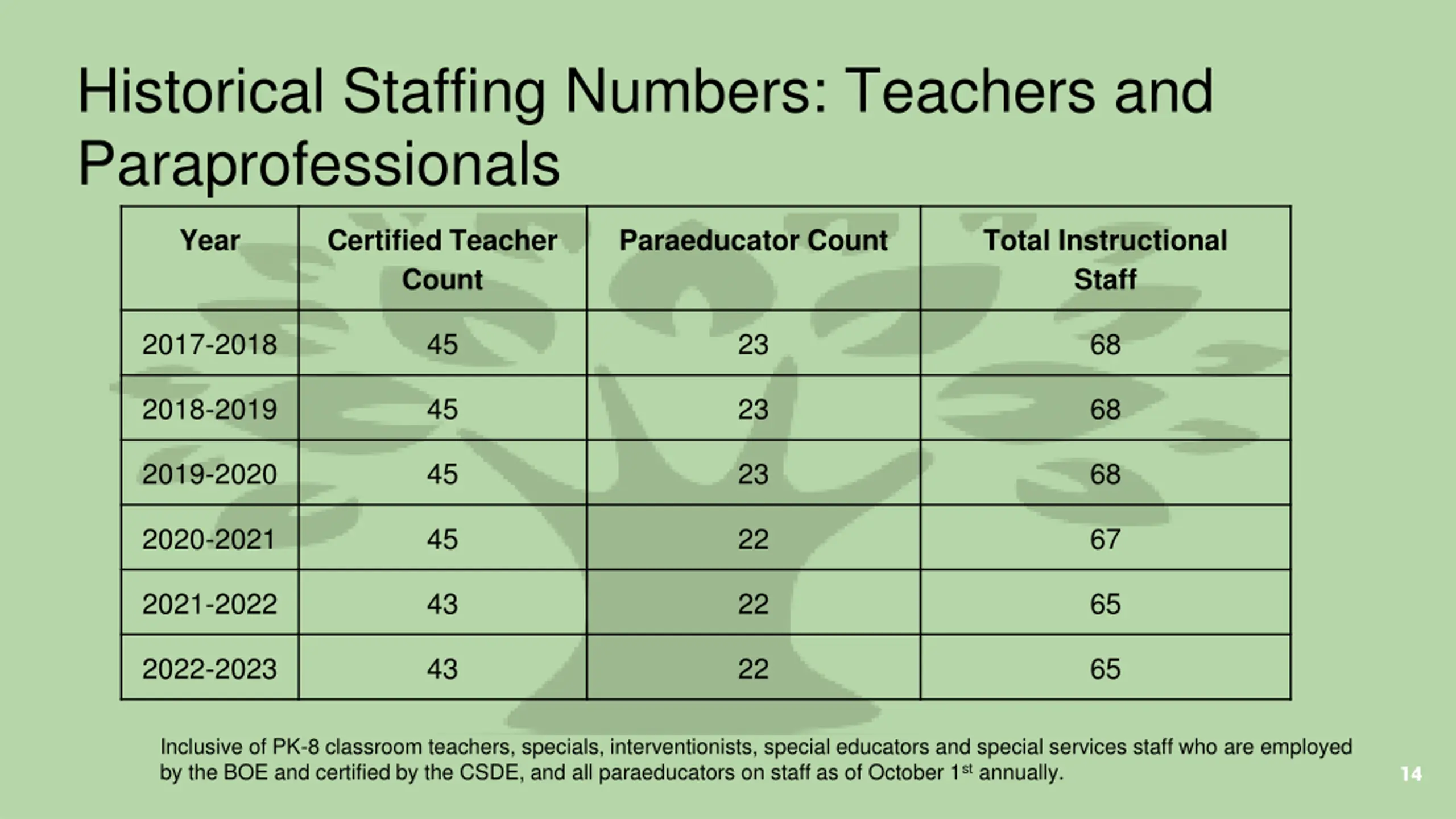 Historical Staffing Numbers: Teachers and Paraprofessionals Year Certified Teacher Count Paraeducator Count Total Instructional Staff 2017-2018 45 23 68 2018-2019 45 23 68 2019-2020 45 23 68 2020-2021 45 22 67 2021-2022 43 22 65 2022-2023 43 22 65 Inclusive of PK-8 classroom teachers, specials, interventionists, special educators and special services staff who are employed by the BOE and certified by the CSDE, and all paraeducators on staff as of October 1stannually. 14