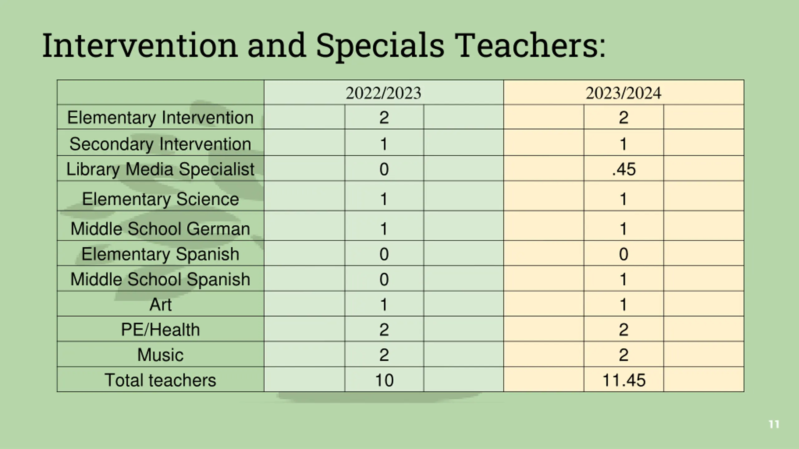 Intervention and Specials Teachers: 2022/2023 2 1 0 2023/2024 2 1 .45 Elementary Intervention Secondary Intervention Library Media Specialist Elementary Science 1 1 Middle School German Elementary Spanish Middle School Spanish Art PE/Health Music Total teachers 1 0 0 1 2 2 10 1 0 1 1 2 2 11.45 11