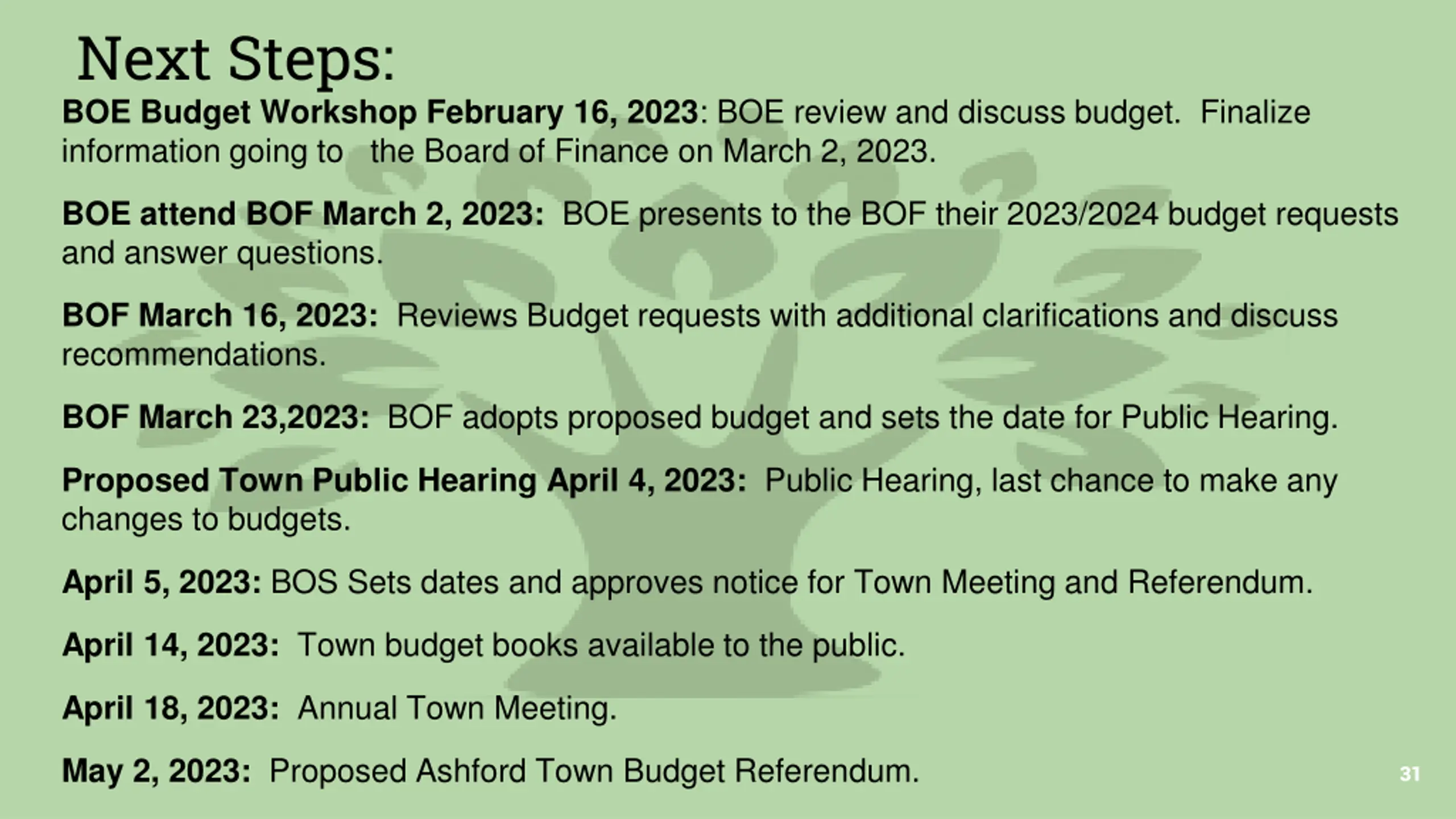 Next Steps: BOE Budget Workshop February 16, 2023: BOE review and discuss budget. Finalize information going to the Board of Finance on March 2, 2023. BOE attend BOF March 2, 2023: BOE presents to the BOF their 2023/2024 budget requests and answer questions. BOF March 16, 2023: Reviews Budget requests with additional clarifications and discuss recommendations. BOF March 23,2023: BOF adopts proposed budget and sets the date for Public Hearing. Proposed Town Public Hearing April 4, 2023: Public Hearing, last chance to make any changes to budgets. April 5, 2023: BOS Sets dates and approves notice for Town Meeting and Referendum. April 14, 2023: Town budget books available to the public. April 18, 2023: Annual Town Meeting. May 2, 2023: Proposed Ashford Town Budget Referendum. 31