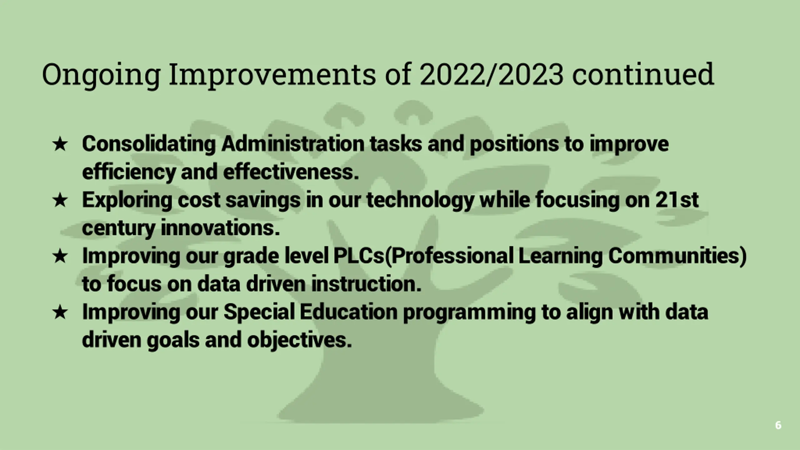 Ongoing Improvements of 2022/2023 continued Consolidating Administration tasks and positions to improve efficiency and effectiveness. Exploring cost savings in our technology while focusing on 21st century innovations. Improving our grade level PLCs(Professional Learning Communities) to focus on data driven instruction. Improving our Special Education programming to align with data driven goals and objectives. 6