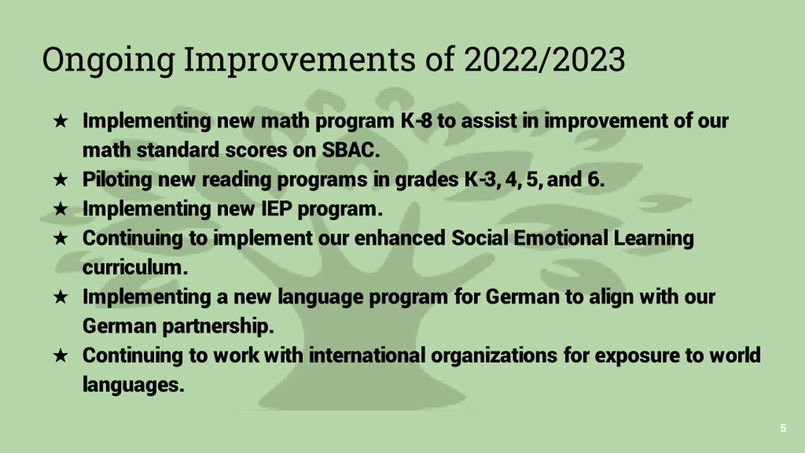 Ongoing Improvements of 2022/2023 Implementing new math program K-8 to assist in improvement of our math standard scores on SBAC. Piloting new reading programs in grades K-3, 4, 5, and 6. Implementing new IEP program. Continuing to implement our enhanced Social Emotional Learning curriculum. Implementing a new language program for German to align with our German partnership. Continuing to work with international organizations for exposure to world languages. 5