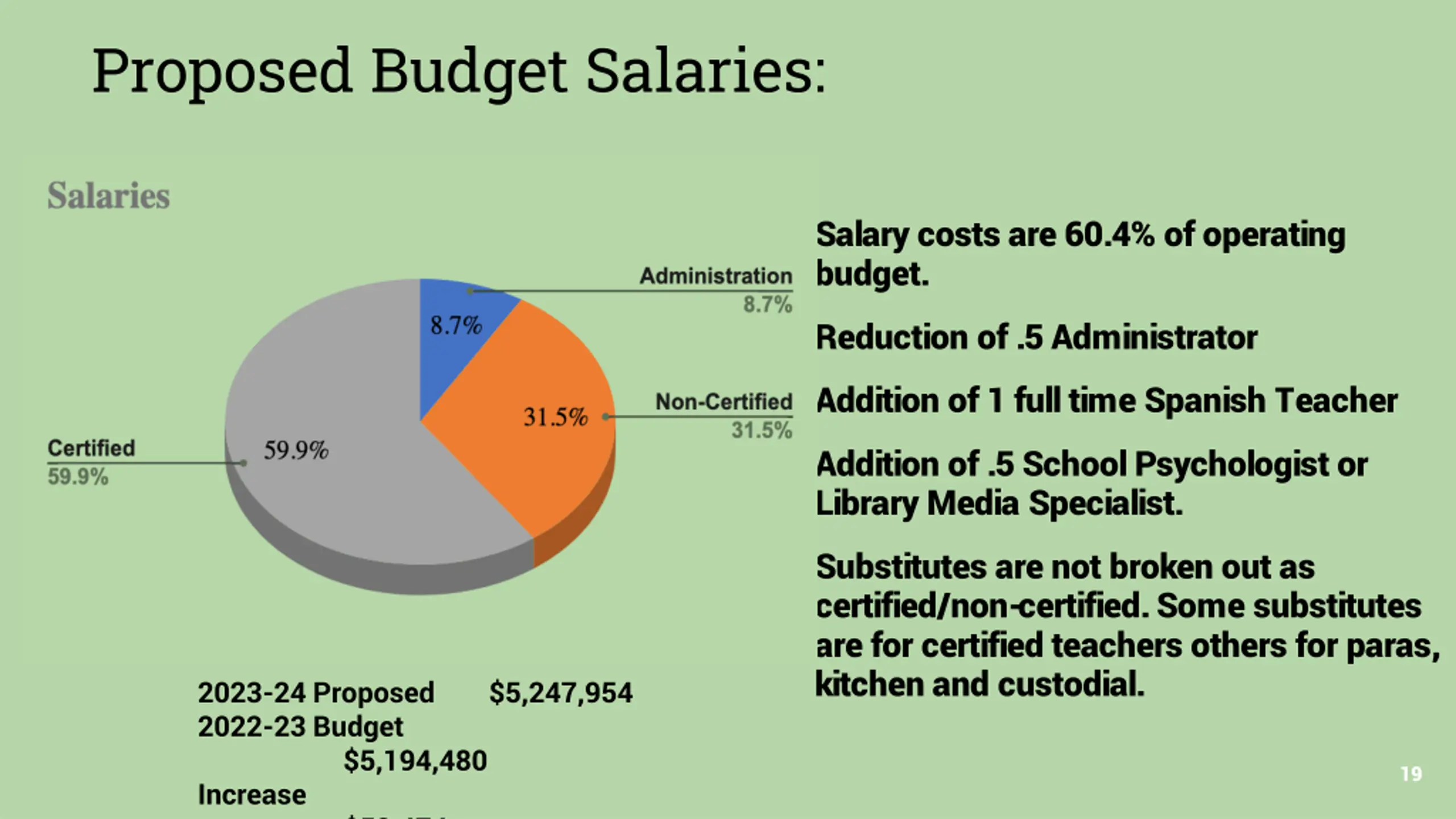 Proposed Budget Salaries: Salary costs are 60.4% of operating budget. Reduction of .5 Administrator Addition of 1 full time Spanish Teacher Addition of .5 School Psychologist or Library Media Specialist. Substitutes are not broken out as certified/non-certified. Some substitutes are for certified teachers others for paras, kitchen and custodial. 2023-24 Proposed 2022-23 Budget $5,247,954 $5,194,480 19 Increase $53,474