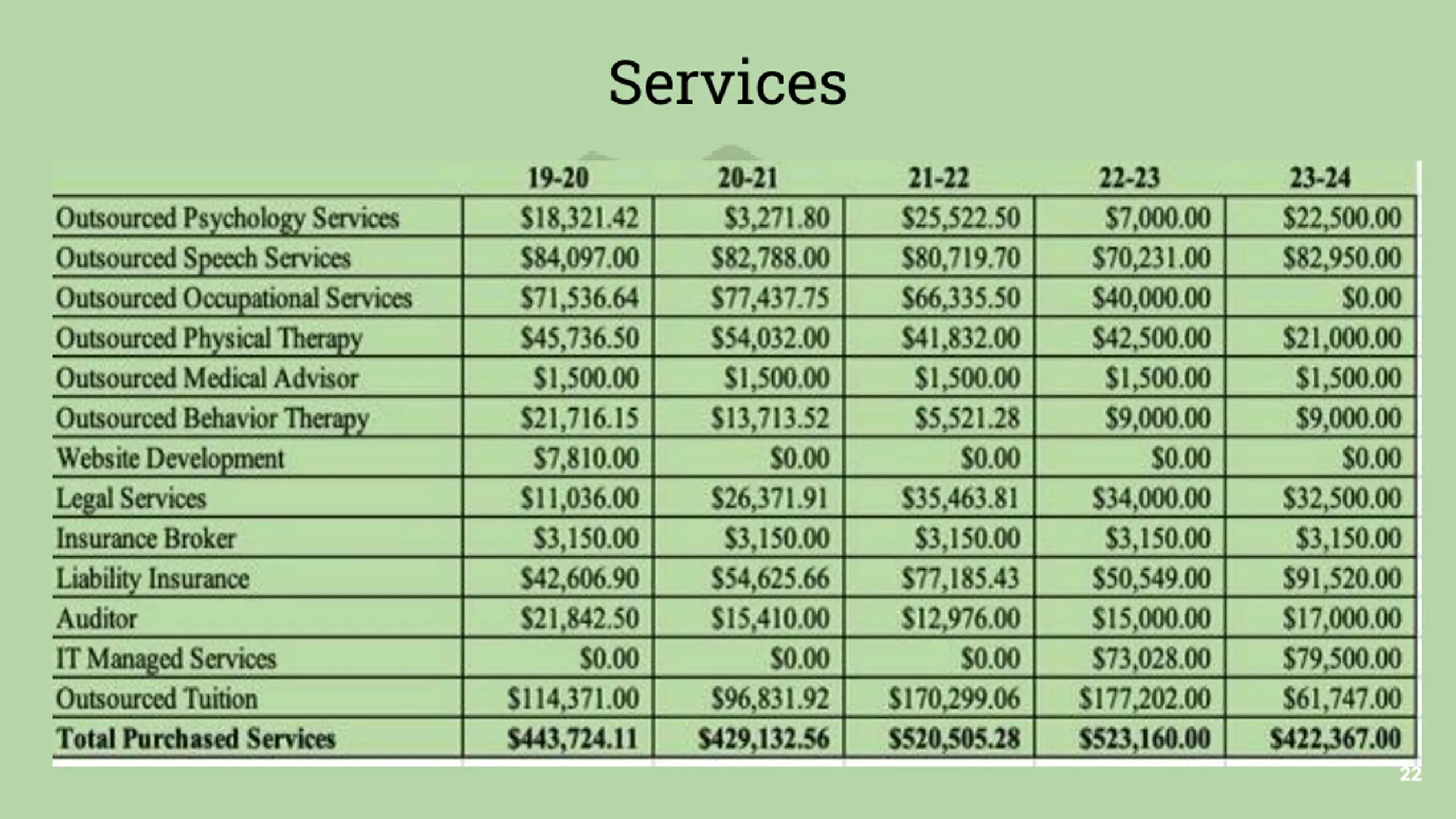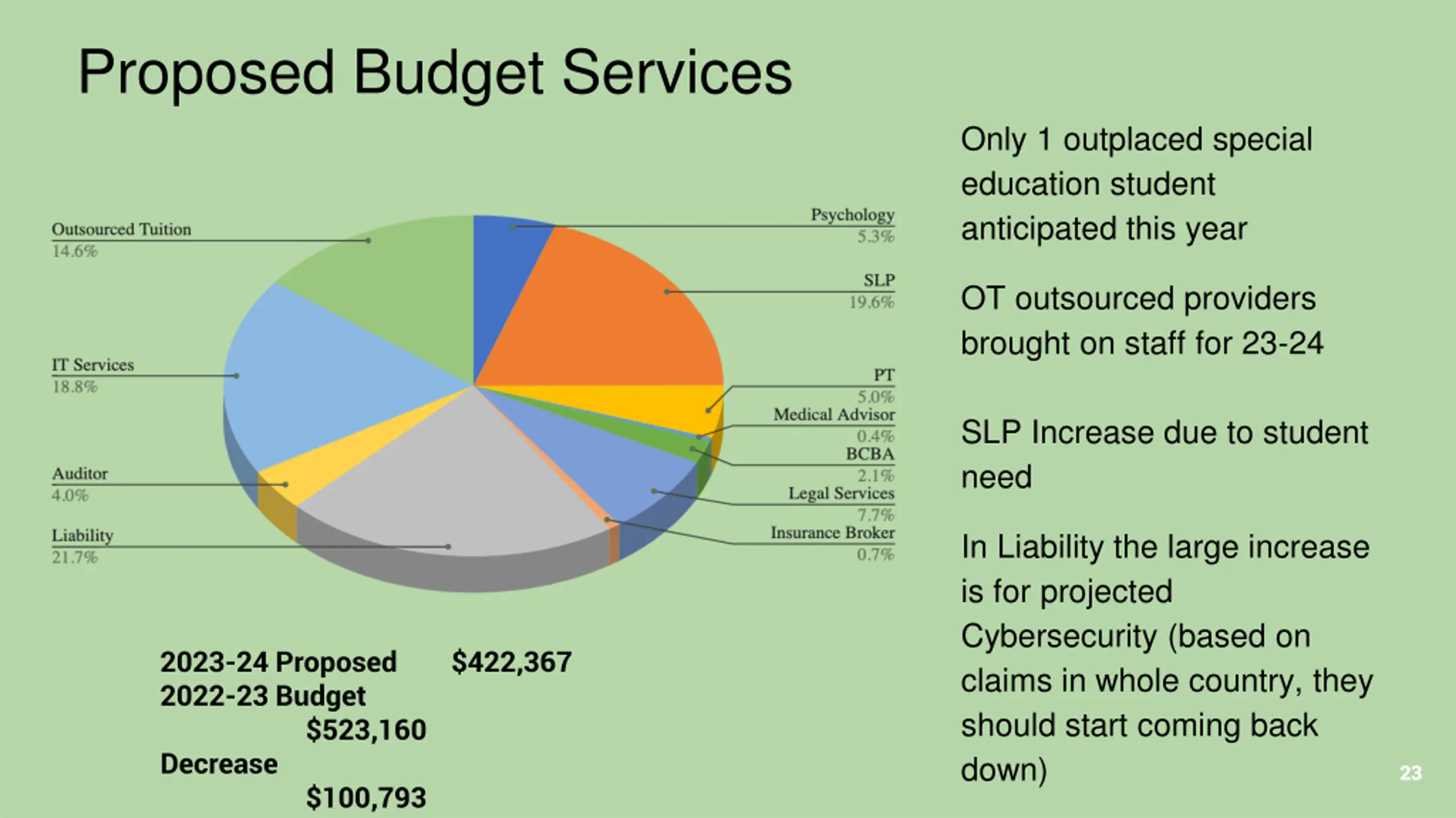 Proposed Budget Services Only 1 outplaced special education student anticipated this year OT outsourced providers brought on staff for 23-24 SLP Increase due to student need In Liability the large increase is for projected Cybersecurity (based on claims in whole country, they should start coming back down) 2023-24 Proposed 2022-23 Budget $422,367 $523,160 Decrease 23 $100,793 % decrease