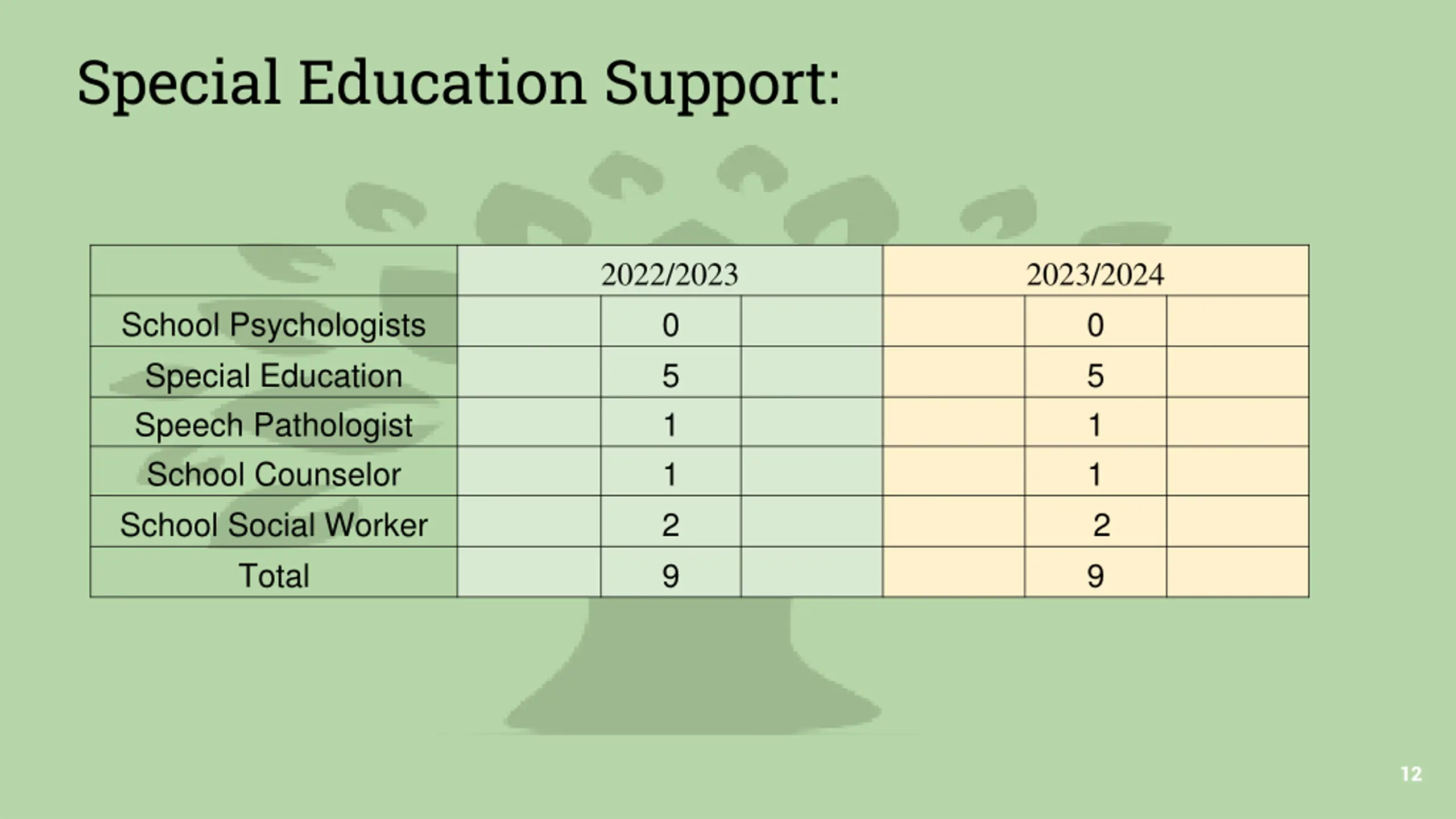 Special Education Support: 2022/2023 0 5 1 1 2 9 2023/2024 0 5 1 1 2 9 School Psychologists Special Education Speech Pathologist School Counselor School Social Worker Total 12