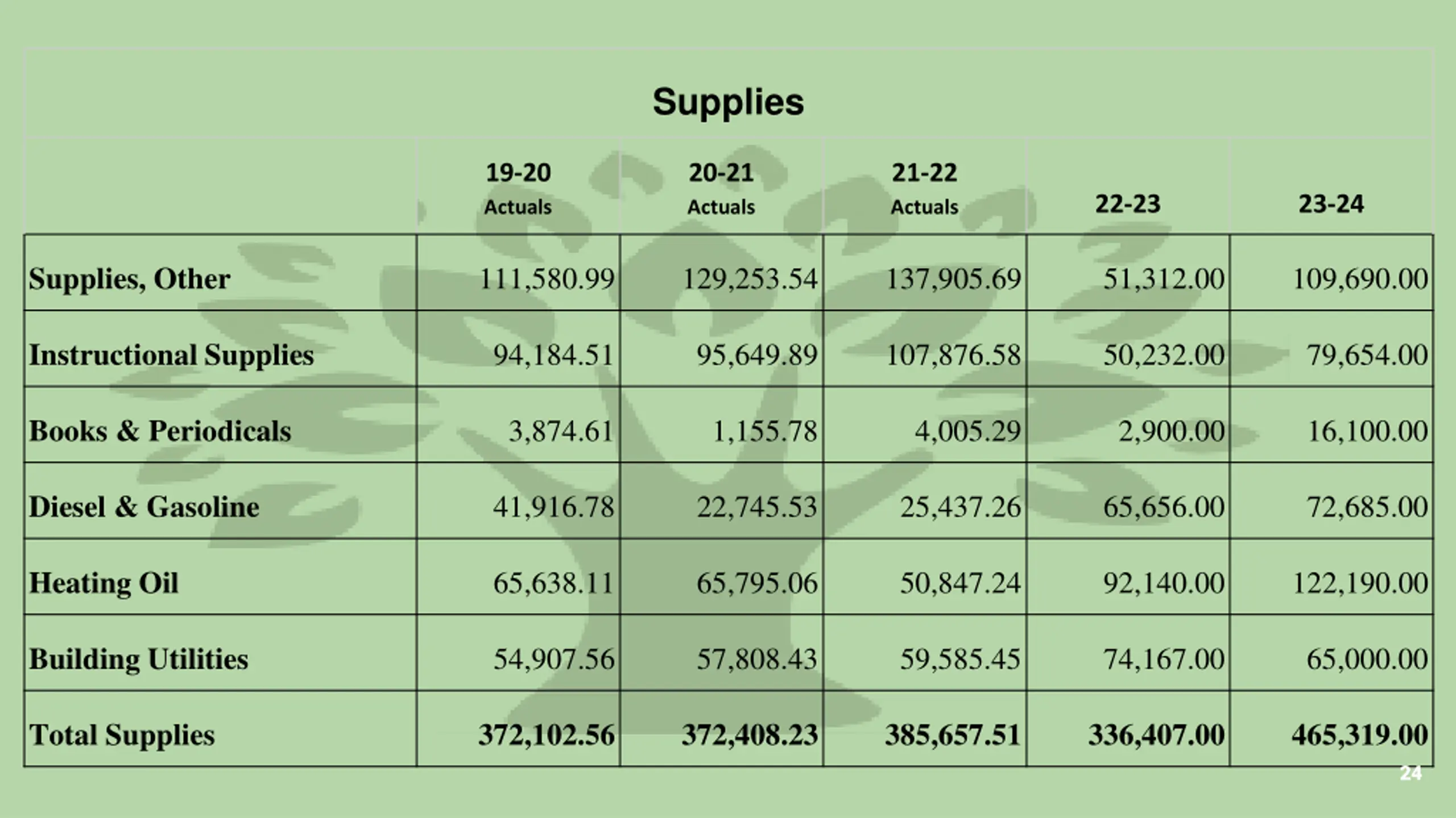 Supplies 19-20 Actuals 20-21 Actuals 21-22 Actuals 22-23 23-24 Supplies, Other 111,580.99 129,253.54 137,905.69 51,312.00 109,690.00 Instructional Supplies 94,184.51 95,649.89 107,876.58 50,232.00 79,654.00 Books & Periodicals 3,874.61 1,155.78 4,005.29 2,900.00 16,100.00 Diesel & Gasoline 41,916.78 22,745.53 25,437.26 65,656.00 72,685.00 Heating Oil 65,638.11 65,795.06 50,847.24 92,140.00 122,190.00 Building Utilities 54,907.56 57,808.43 59,585.45 74,167.00 65,000.00 Total Supplies 372,102.56 372,408.23 385,657.51 336,407.00 465,319.00 24