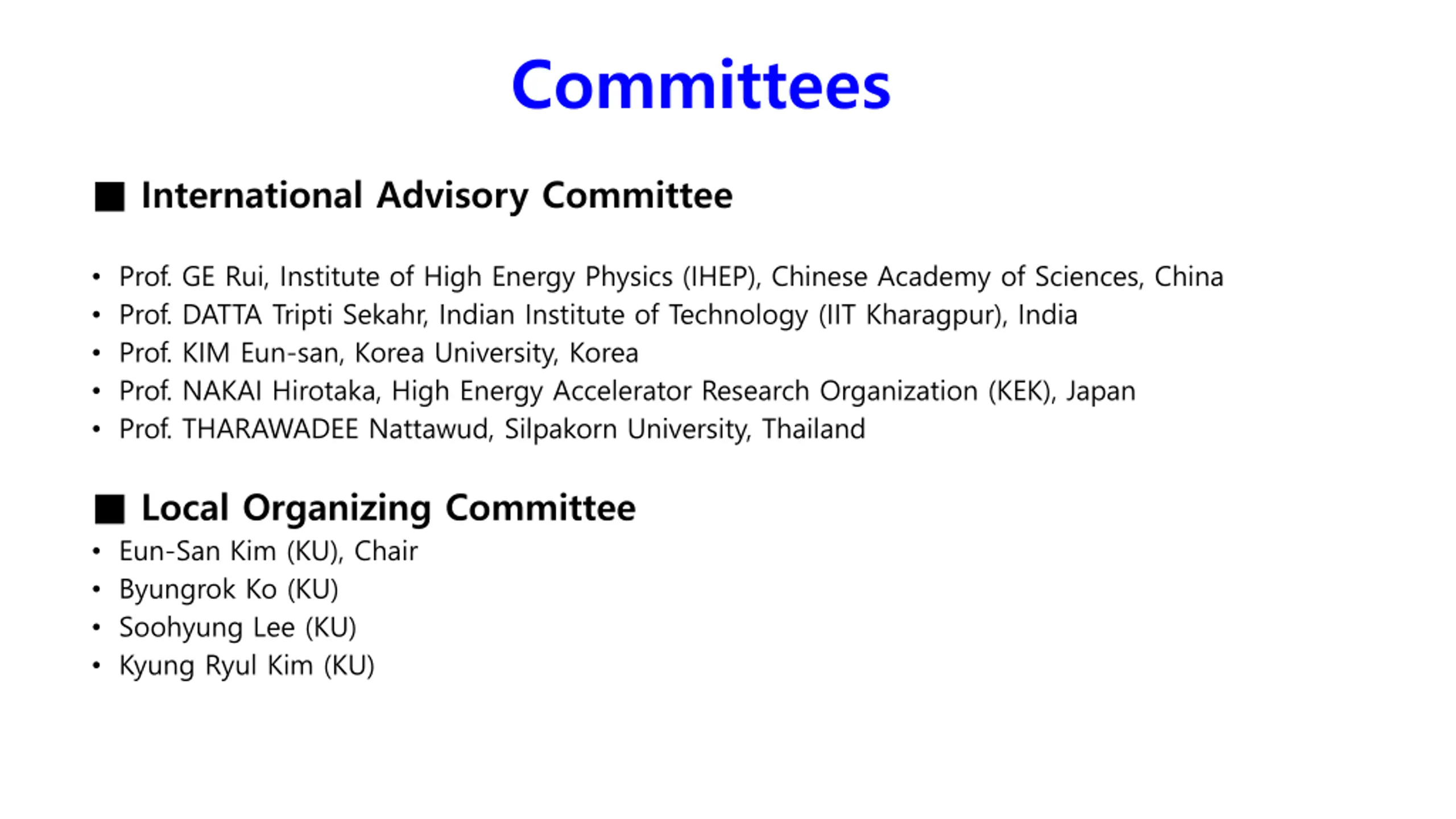 Committees International Advisory Committee Prof. GE Rui, Institute of High Energy Physics (IHEP), Chinese Academy of Sciences, China Prof. DATTA Tripti Sekahr, Indian Institute of Technology (IIT Kharagpur), India Prof. KIM Eun-san, Korea University, Korea Prof. NAKAI Hirotaka, High Energy Accelerator Research Organization (KEK), Japan Prof. THARAWADEE Nattawud, Silpakorn University, Thailand Local Organizing Committee Eun-San Kim (KU), Chair Byungrok Ko (KU) Soohyung Lee (KU) Kyung Ryul Kim (KU)